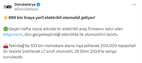 Elektrikli araçlarla ilgili gelişmeler hakkında bilgi veren Dolu Batarya https://twitter.com/DoluBatarya X sosyal medya hesabından şu paylaşımı yaptı.