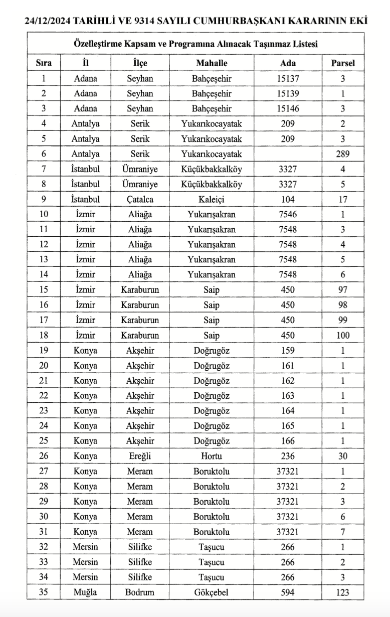 Bugünkü 32763 Sayılı Resmi Gazete’de yayımlanan Cumhurbaşkanı Kararı ile İstanbul, İzmir, Adana, Antalya, Muğla, Konya ve Mersin’de yer alan toplamda 35 adet taşınmazın özelleştirme kapsam ve programına alındığı belirtildi.