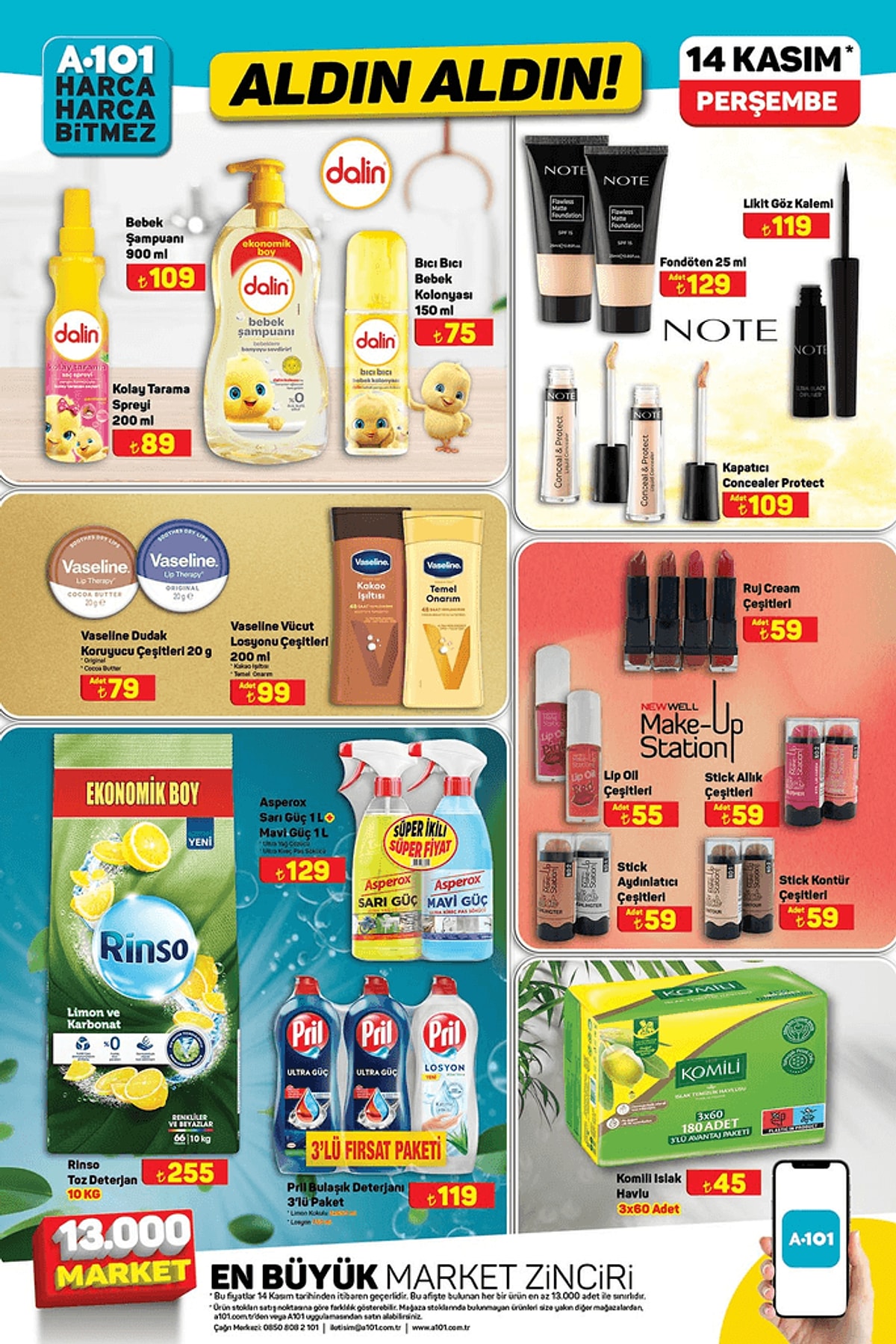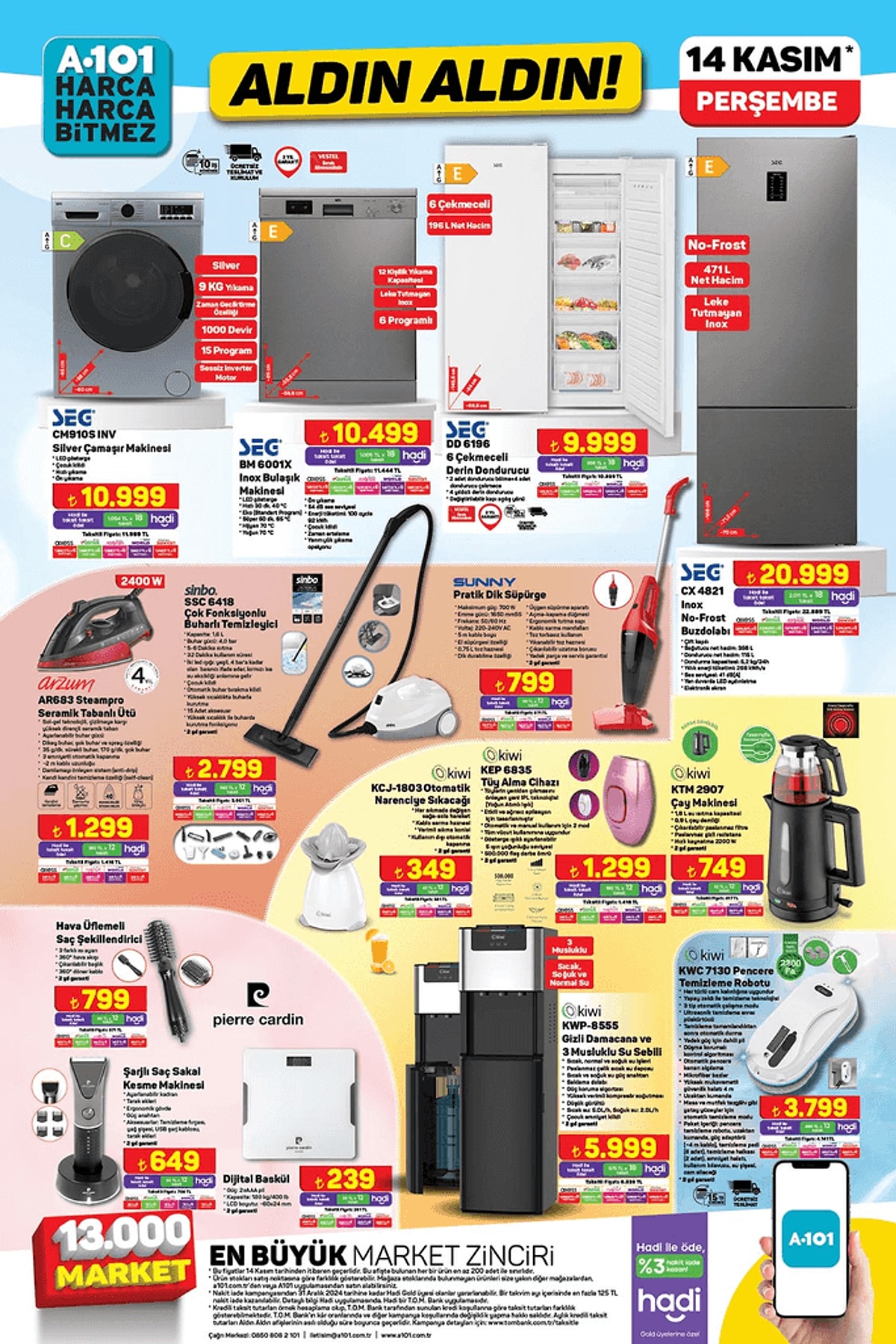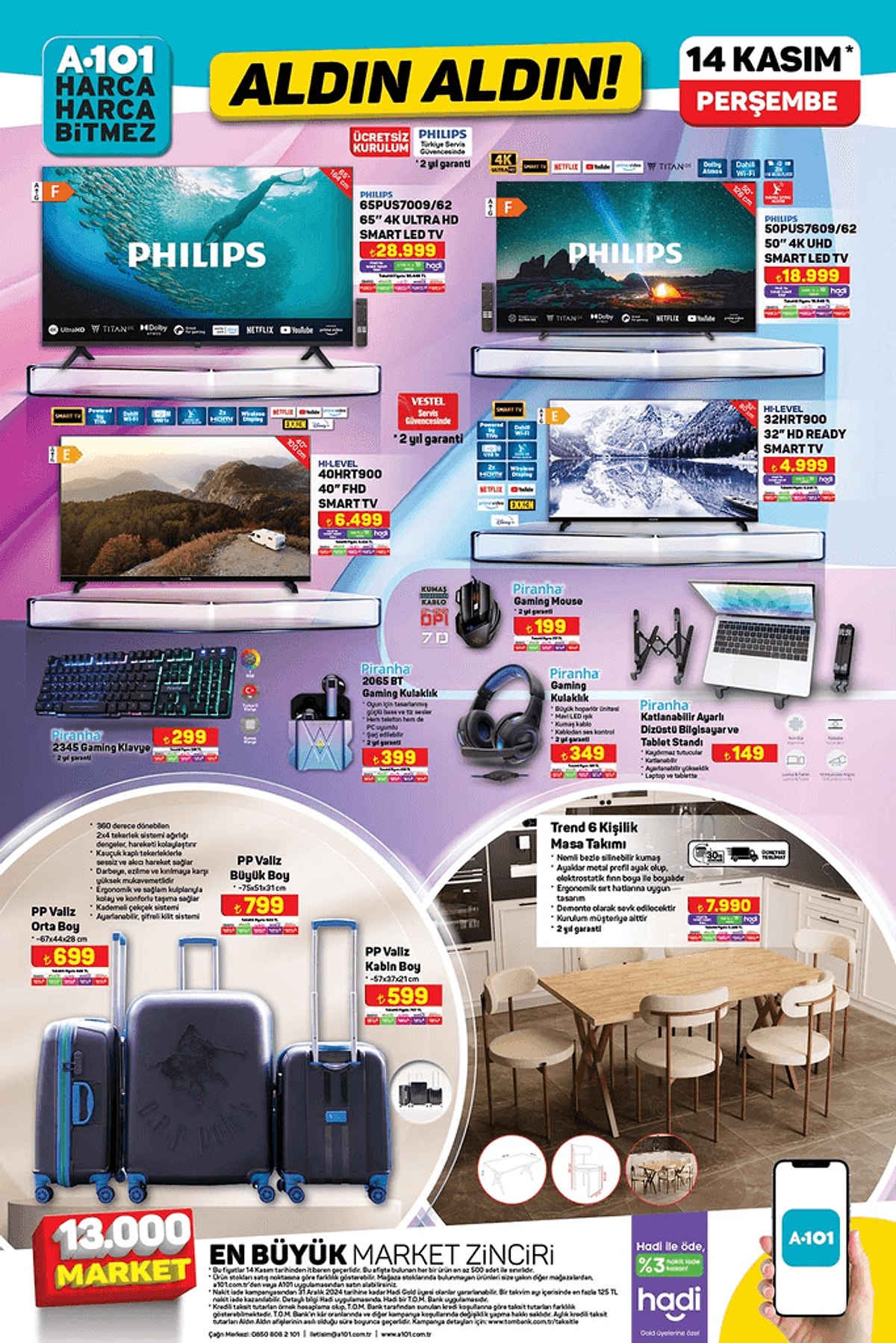 Türkiye'nin en büyük perakende market zincirlerinden A101'de 14 Kasım 2024 Perşembe günü birçok üründe indirim var. A101'e Televizyon, valiz çeşitleri,Ptarik dik süpütge ve cam temizleme robotu geliyor.