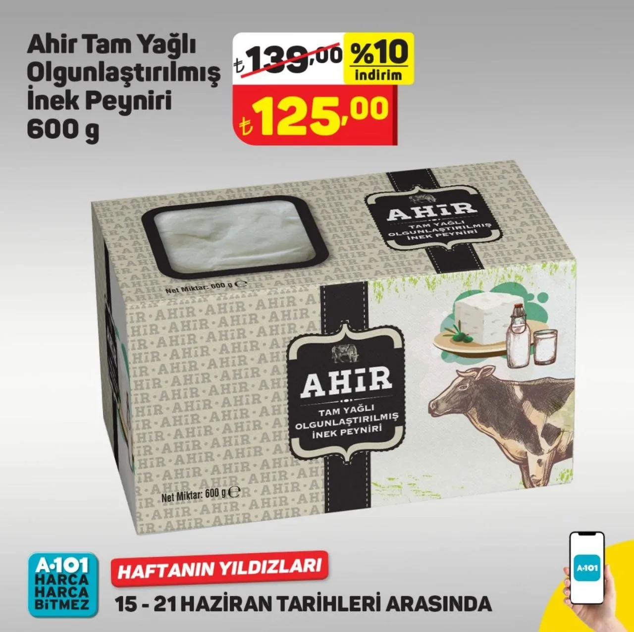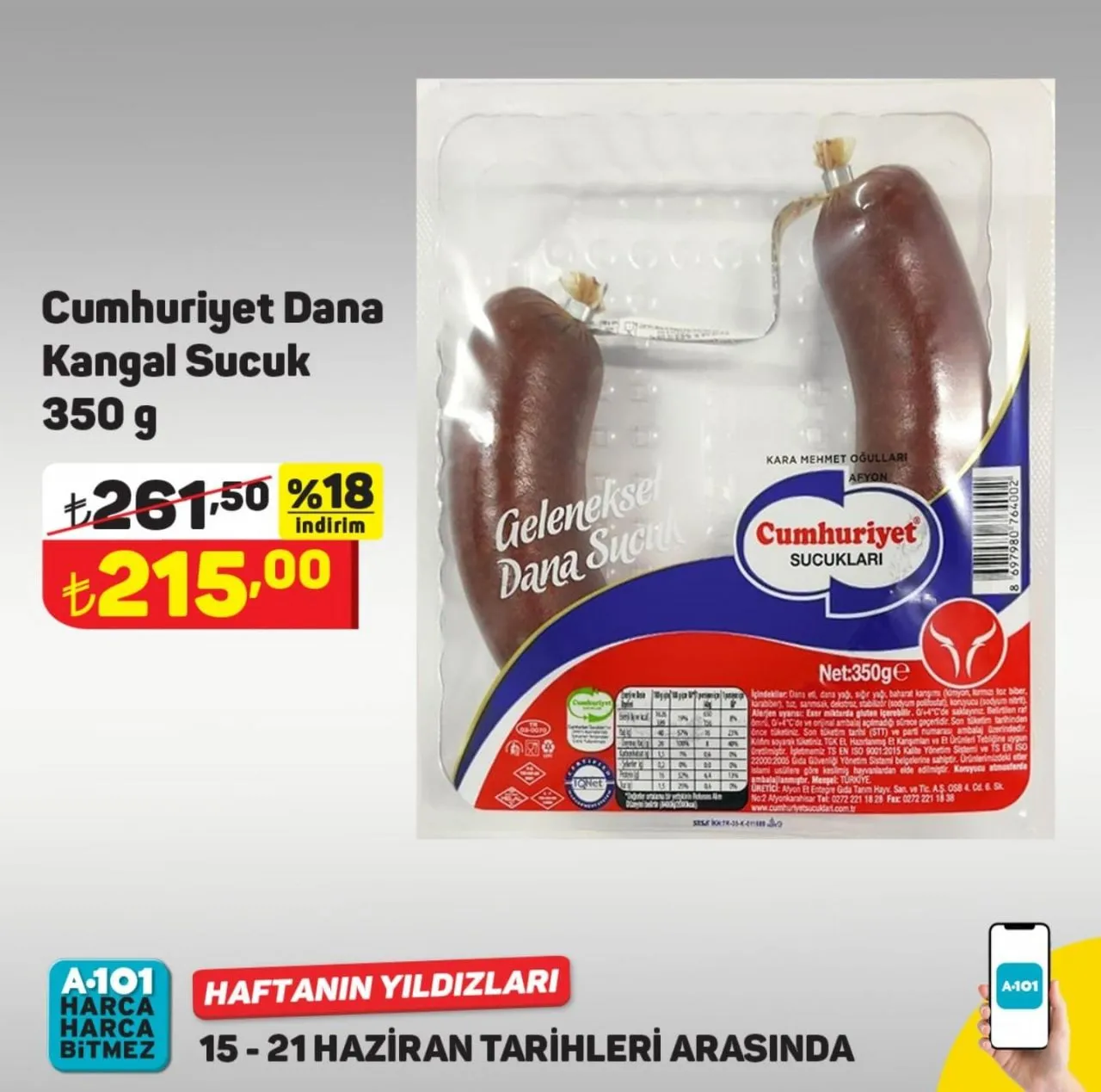 A101 markete 16-21 Haziran hangi ürünler gelecek, biribirnden çeşitli gıda ve kişisel bakım ürünleri raflardaki yerini alacak. Cumhuriyet Dana Kangal Sucuk 215 Türk Lirası, Birşah Süt 1 Litre 22 Türk Lirası, Piliç Nugget 32,75 Türk Lirası.