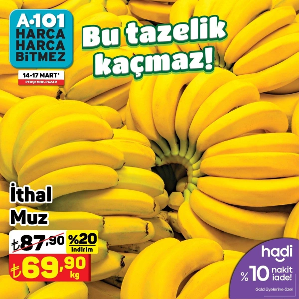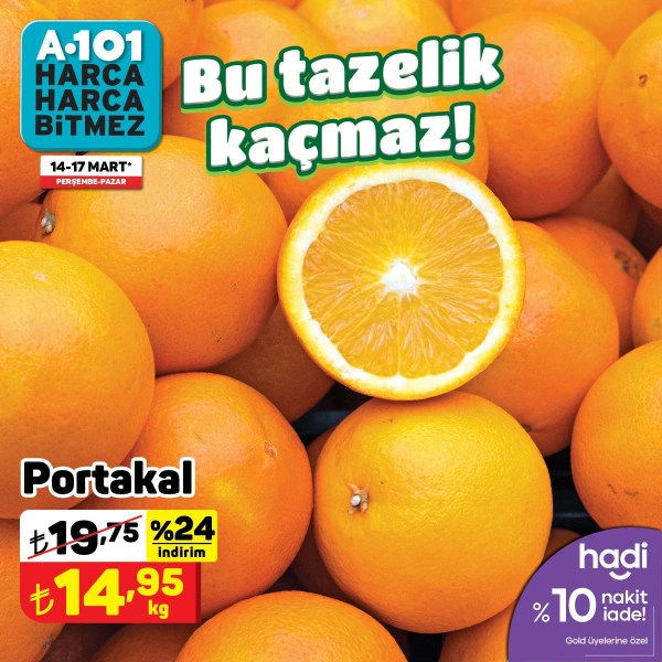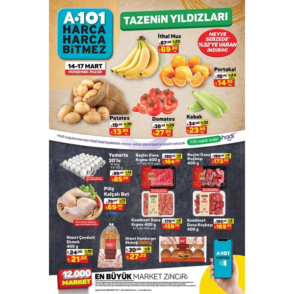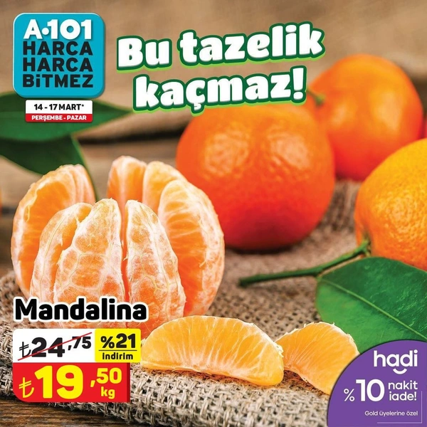A101'de birçok seçili üründe indirim var. Piliç Kalçalı But 69.90 TL, Mandalina 19.50 TL, 400 g Kombinet Dana Kıyma 159 TL, Dear Body Duş Jeli Çeşitleri 25.50 TL.