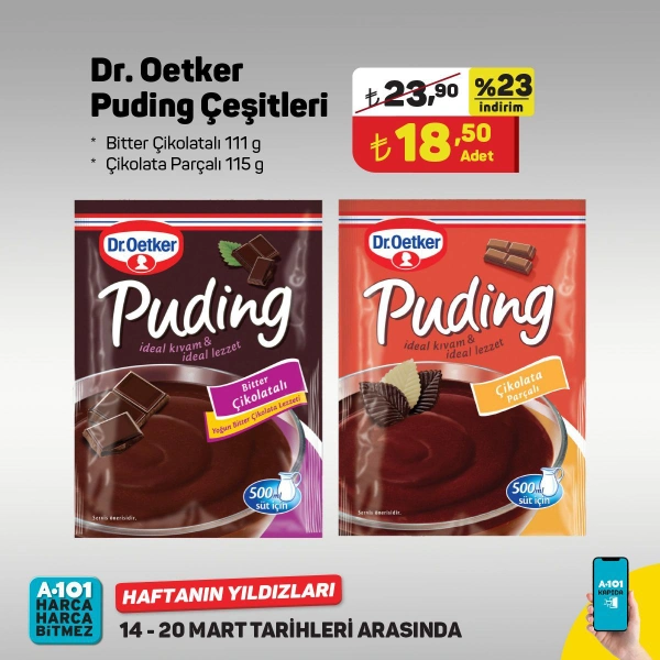 Dr. Oetker Puding Çeşitleri 18.50 Türk Lirası.