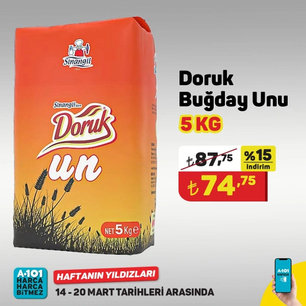5 kg Doruk Buğday Unu 74.75 Türk Lirası.