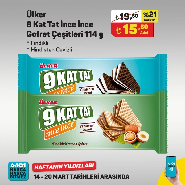 Ülker 9 Kat tat İnce İnce Gofret Çeşitleri 15.50 Türk Lirası.