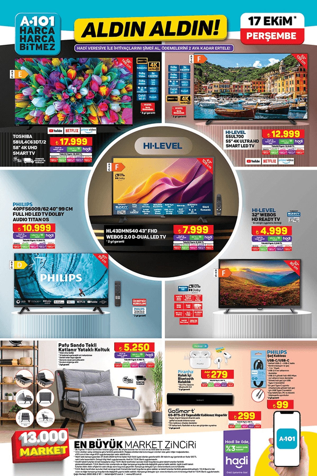 A101 17 Ekim 2024 aktüel ürünler kataloğunu internet üzrinden payşlaştı. A101'de Toshiba 58" 4K UHD Smart Tv 17.999 TL, Pafu Sando Tekli Katlanır Yataklı Koltuk 5.250 TL, English Home Stand Mikseri 3.799 TL, Pratik Basmalı El Rondosu 249 TL.