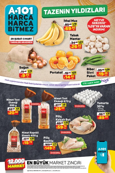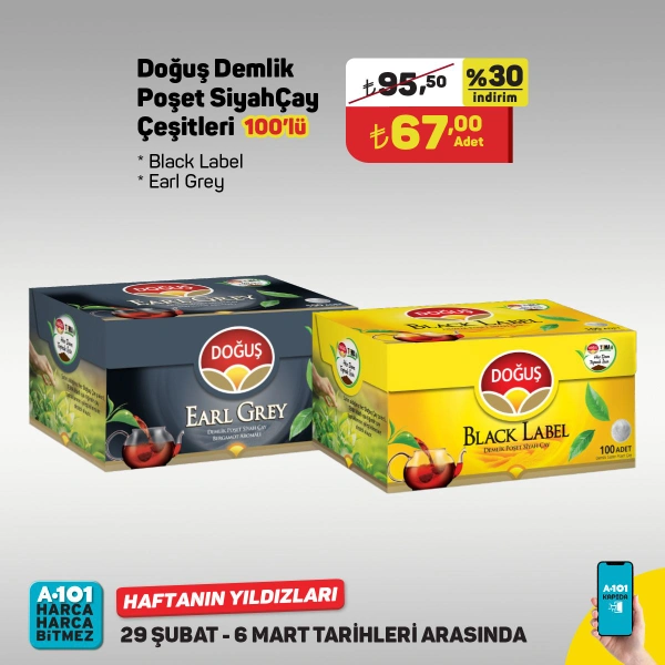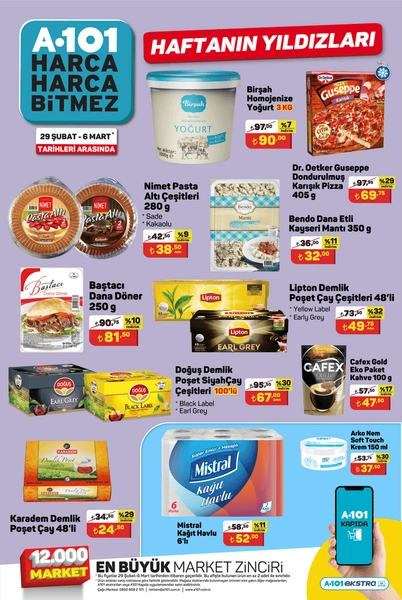 2 Mart 2024 Cumartaesi günü A101'de 100'lü Doğuş Demlik Poşet Siyah ÇAy Çeşitleri 67 TL, 1 L Birşah Laktozsuz Süt 31.50 TL,350 g Bendo Dana Etli Kayseri Mantı 32 TL,100 g Kurukahveci Mehmet Efendi Türk Kahvesi 39.50 TL.