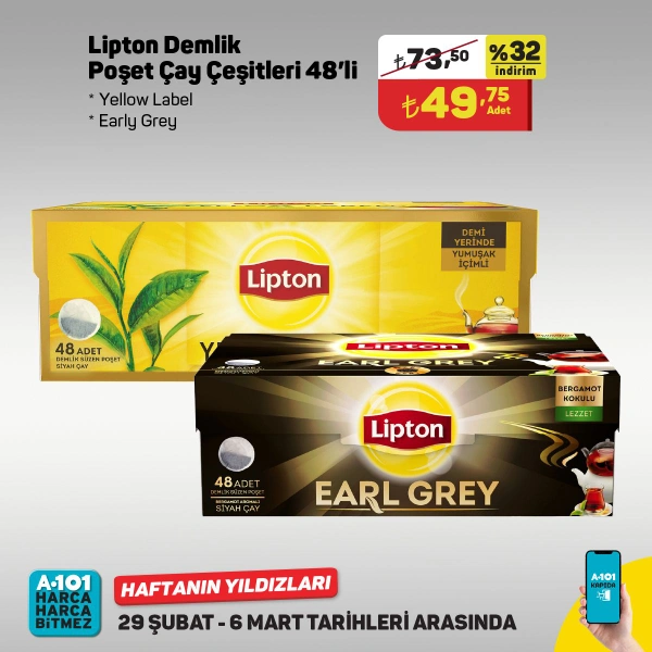 - 48'li Lipton Demlik Poşet Çay Çeşitleri 49.75 Türk Lirası.