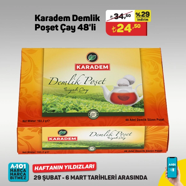 - 48'li Karadem Demlik Poşet Çay 24.50 Türk Lirası.