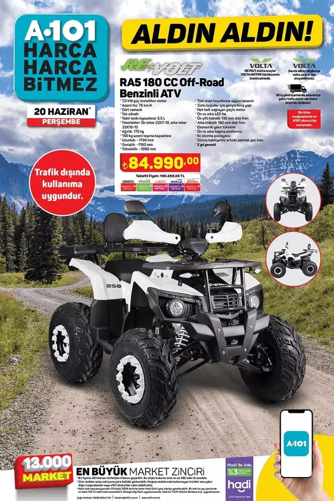 Türkiye'nin en büyük perakende market zincirlerinden A101 20 Haziran 2024 aktüel ürünler kataloğunu paylaştı. A101'de birçok üründe indirimler sizleri bekliyor. JVC 50' 4K Ultra HD HD Android Tv 11.999 TL, Homend Grillant Inox Tost Makinesi 1.499 TL, Revolt RA5 180 cc Off-Road Benzinli ATV için 84.990 TL.