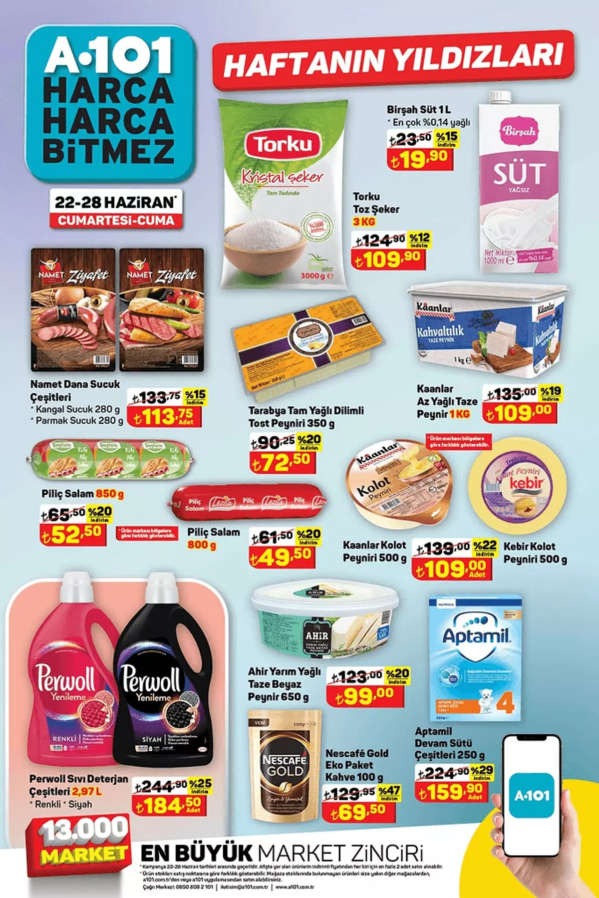 A101 22 - 28 Haziran 2024 aktüel ürünler kataloğunu yayımladı. Namet Dana Kangal / Parmak Sucuk 280 gr 113,75 TL, Aptamil Devam Sütü Çeşitleri 250 gr 159,90 TL, Namet Dana Kangal / Parmak Sucuk 280 gr 113,75 TL.