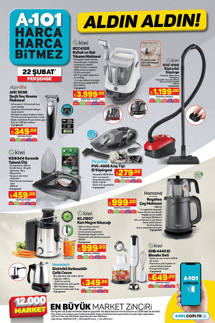 A101'de bu perşembe günü birbirinden cazip seçili ürünlerde indirim fırsatı sunuluyor. 22 Şubat 2024 A101 kataloğunda yer alan beyaz eşyadan cep telefonlarına birçok üründe indirim var. 22 Şubat 2024 A101 aktüel ürünler kataloğu fiyat listesi.