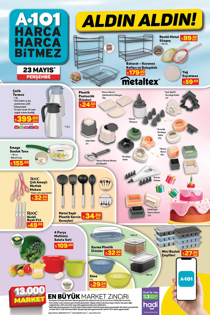 Tüketiciler tarafından merakla beklenen 23 Mayıs 2024 tarihli aktüel kataloğunu tüketicilerle paylaşan A101 ev araç gereç ve gıda ürünlerine indirim yaptı.