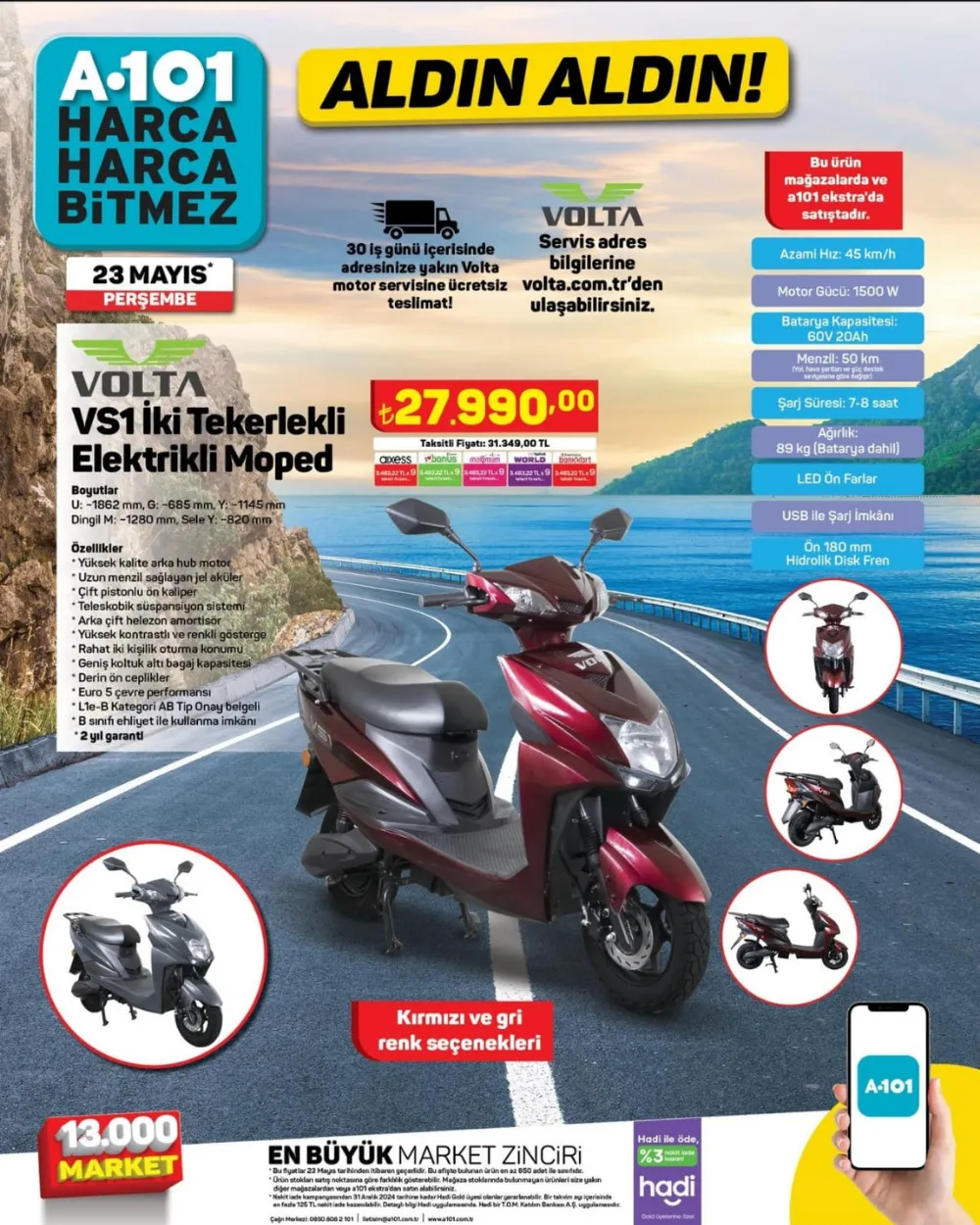 A101'de bu perşembe birçok üründe indirim fırsatı sizleri bekliyor. A101'de bu perşembe VOLTA VS1 İki Tekerlekli Elektrikli Moped 27.990 TL, Familia Natural 3 Karlı 40'lı Tuvalet Kağıdı 219 TL, Sinbo Torbasız Cyclonic Elektrikli Süpürge 1.799 TL, Taraftar Lisanslı Tek Kişilik Nevresim Set 349 TL.