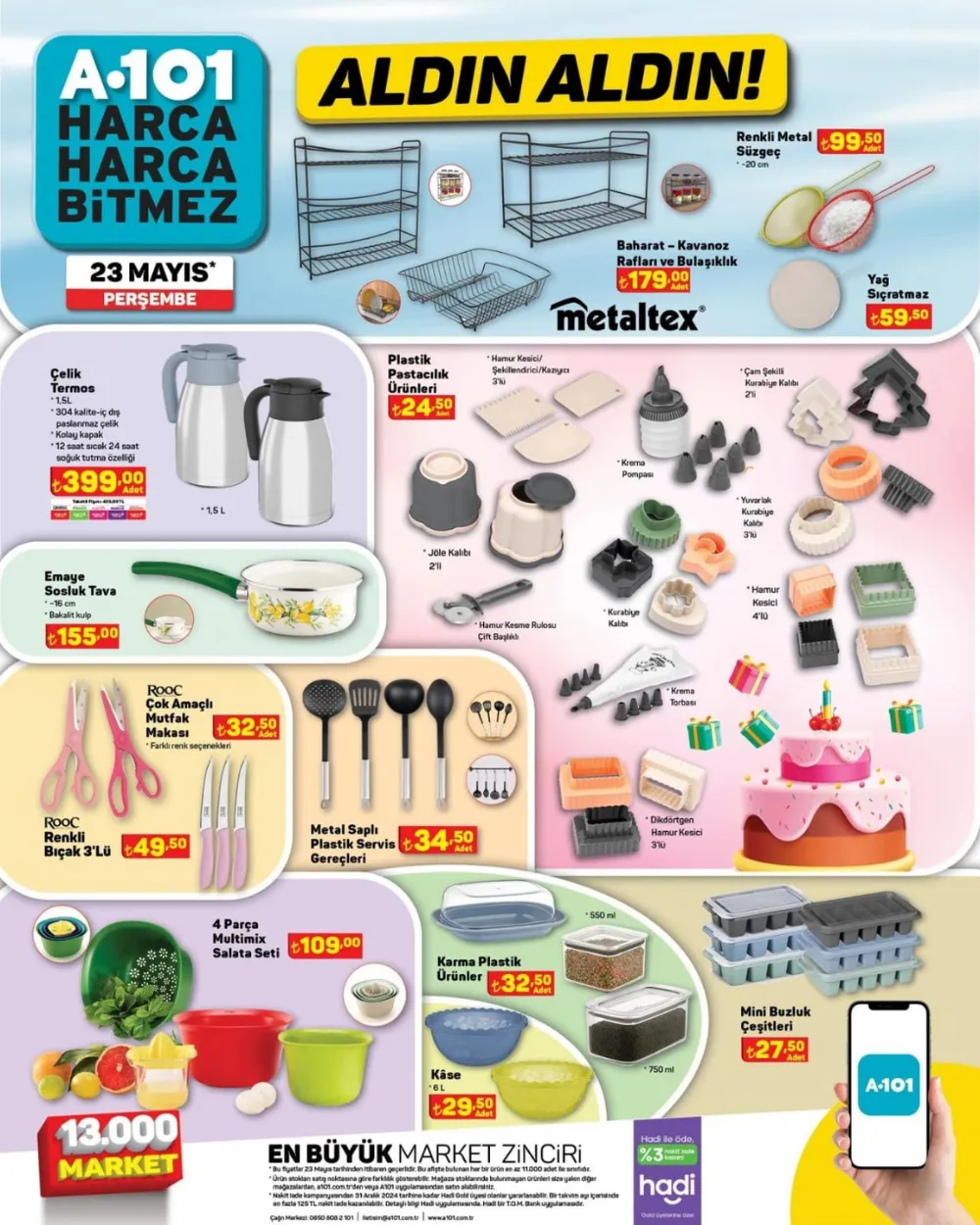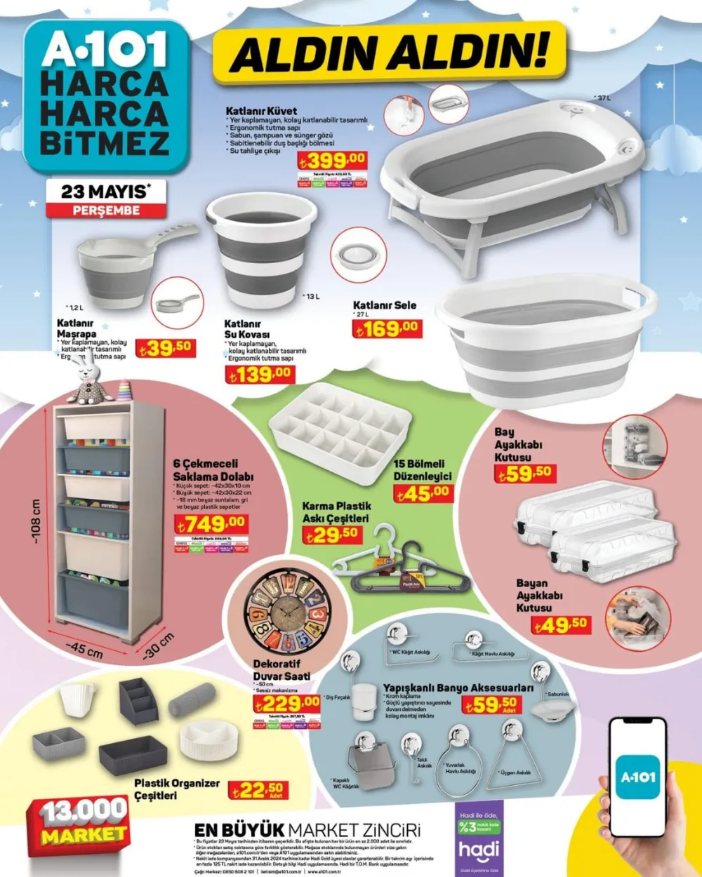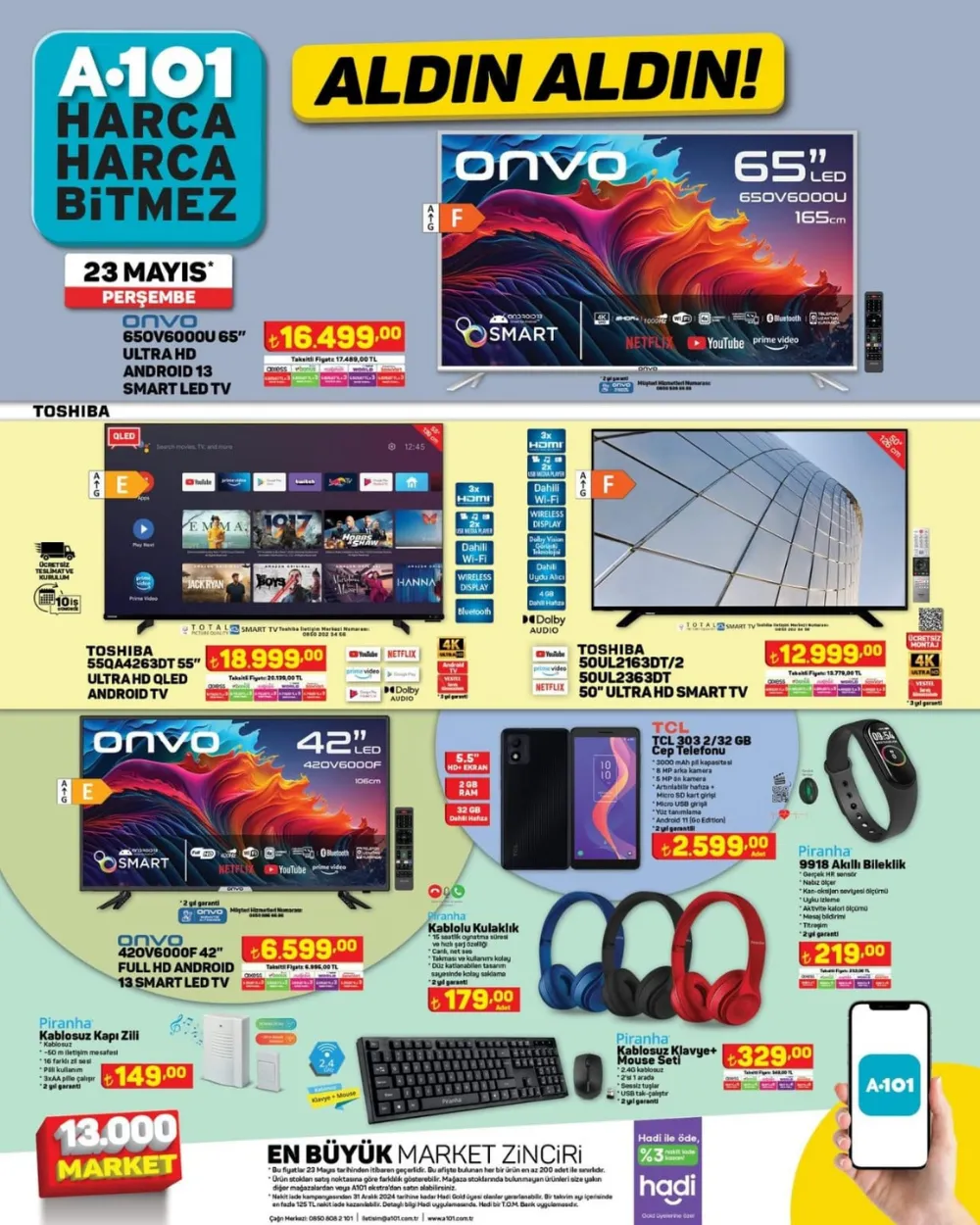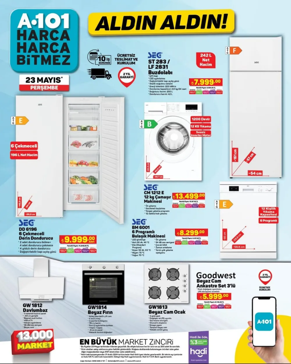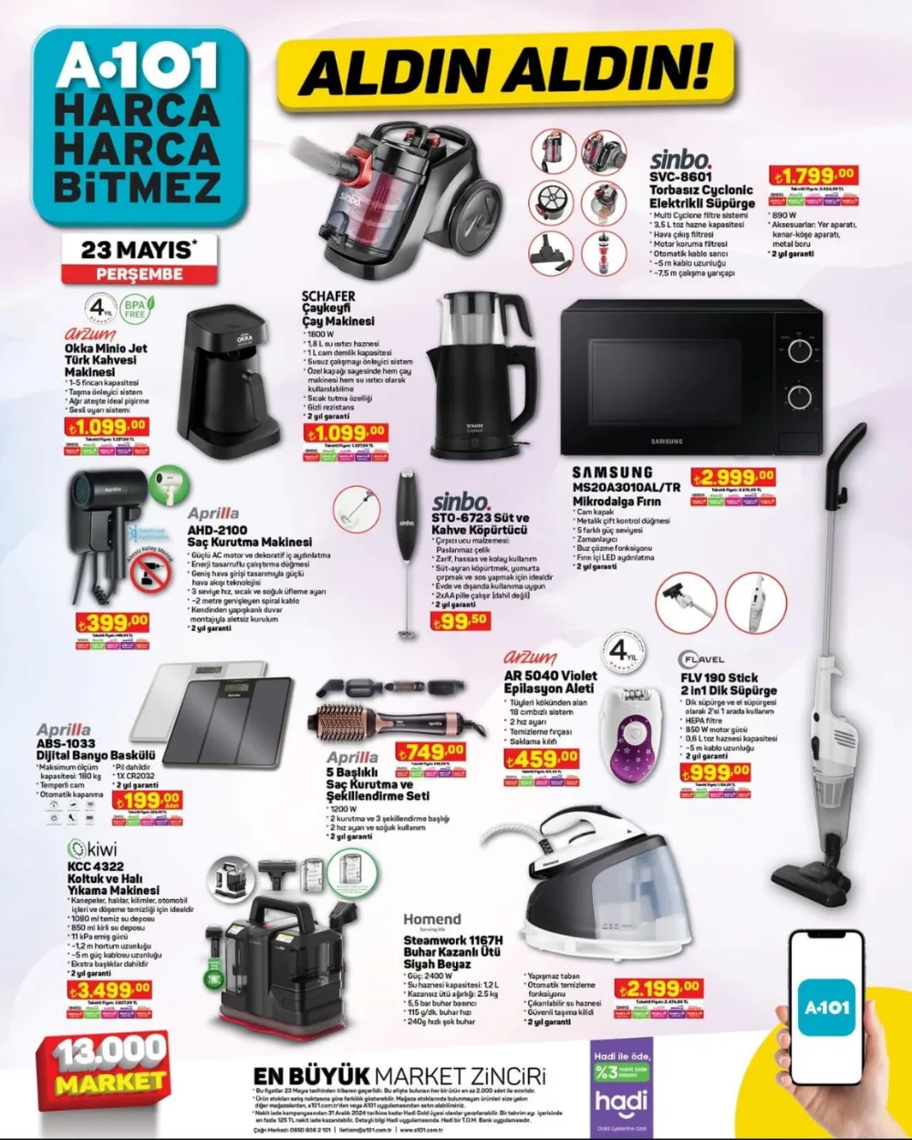 A101 23 Mayıs 2024 perşembe aktüel kataloğunu internet üzerinden paylaştı. 23 Mayıs'ta A101 markete televizyon, halı yıkama makinesi, elektrikli motorlu bisiklet, koltuk takımı geliyor.
