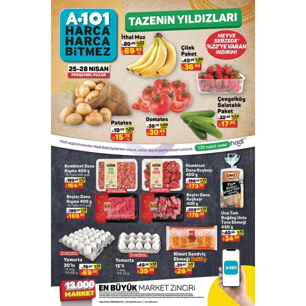 Bu cumartesi A101'de seçili gıda ürünlerinde indirimli ürünler raflarda yerini buldu. İthal Muz 69.90 TL, Çengelköy Salatalık 17.95 TL, 400 g Beşler Dana Kuşbaşı 178 TL, 8'li Ülker Halley Bisküvi 29 TL, 30'lu Yumurta 69.50 TL.