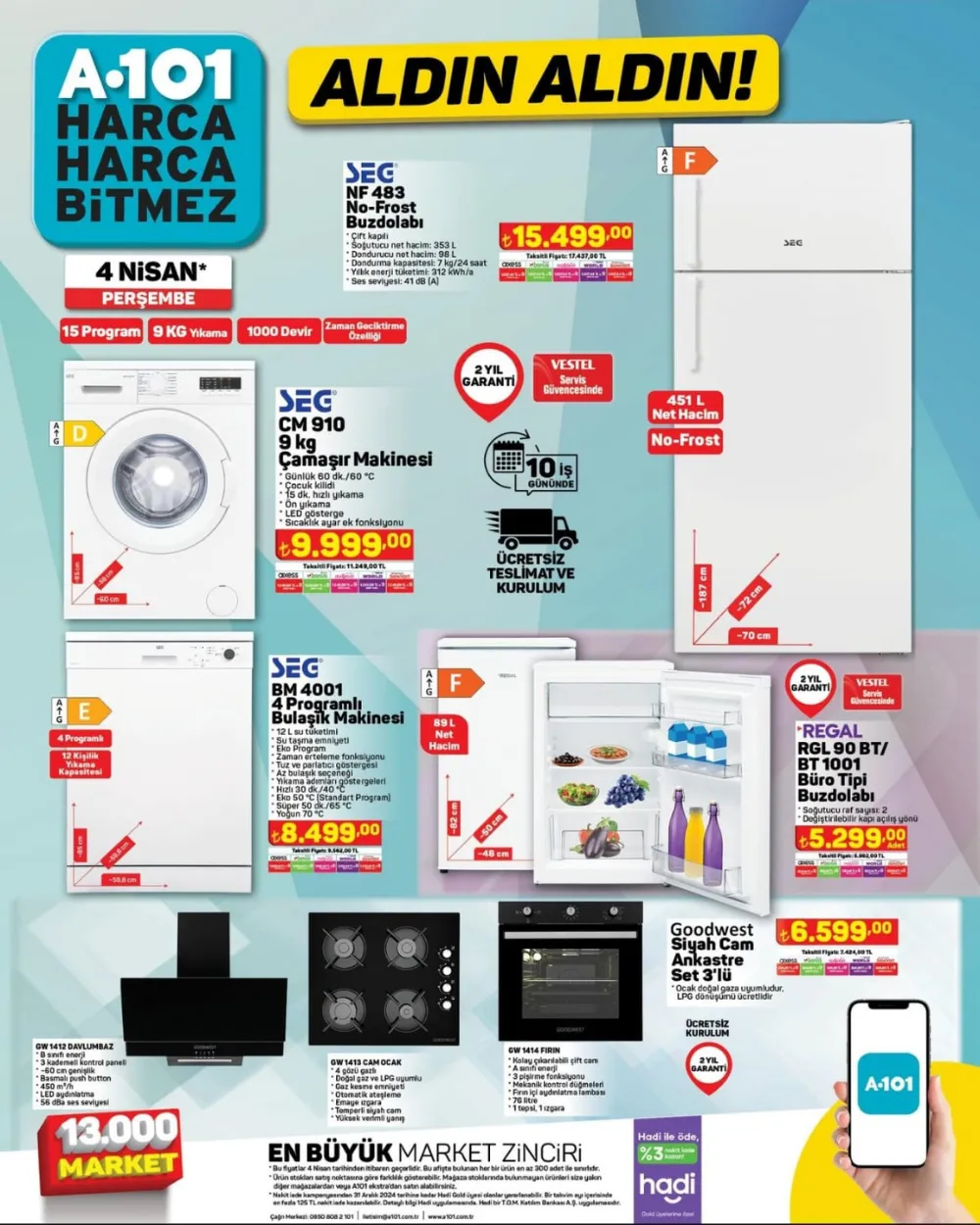 A101 4 Nisan 2024 katoloğunu internet üzerinden paylaştı! 4 Nisan 2024 Perşembe günü A101'de beyaz eşyadan, televizyona, elektrikli bisikletten, kahve makinesine kadar birçok seçili üründe indirim sunuluyor.