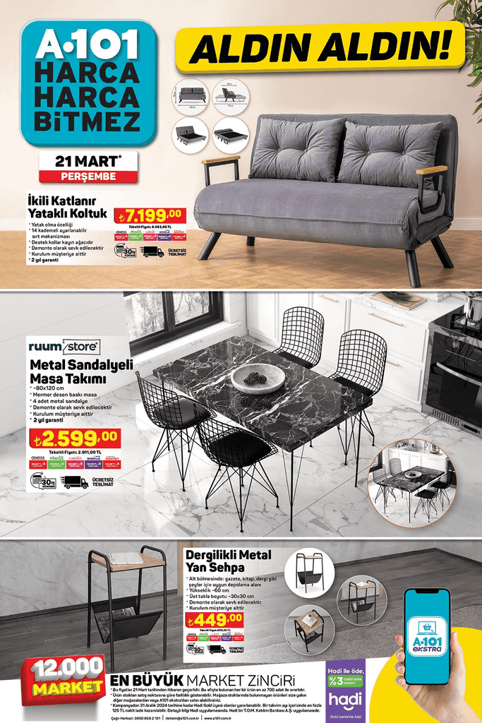 A101'de 21 Mart ile 28 Mart 2024 tarihleri arasında geçerli olacak Aldın Aldın kataloğu belli oldu. A101 21 Mart 2024 Perşembe kataloğu ile satışa sunulacak aktüel ürünleri tek tek belli oldu. 21 Mart A101'de Cam ankastre set fiyatı 6 bin 499 liradan satılıyor. Peki A101'e yarın neler geliyor? A101'e 21 Mart neler gelecek? A101 21-28 Mart 2024 Aktüel ürünler kataloğu...