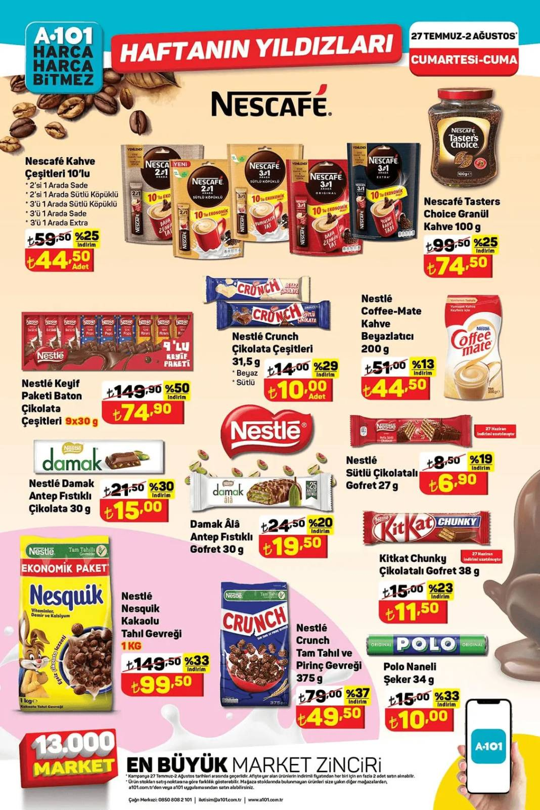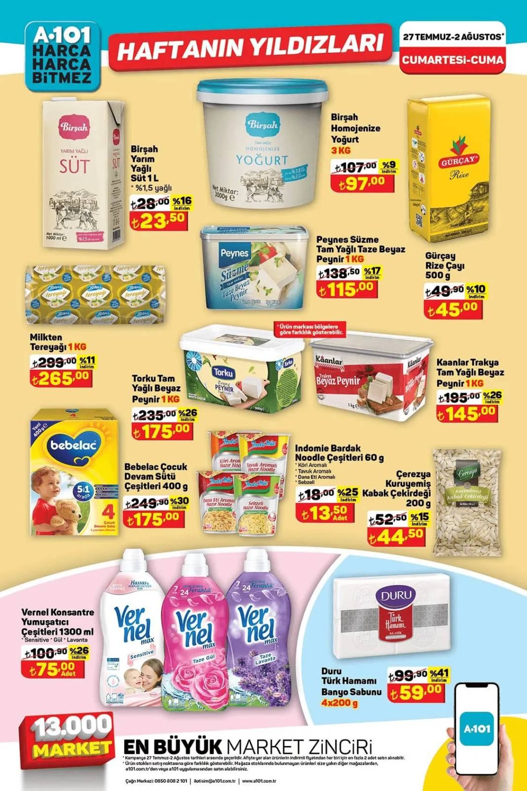 A101'in resmi internet sitesi üzerinden yayımlanan 27 Temmuz tarihli kataloğunda; Süt, bardak noodle çeşitleri, çocuk devam sütü çeşitleri, yoğurt, peynir, çay, tereyağı,
