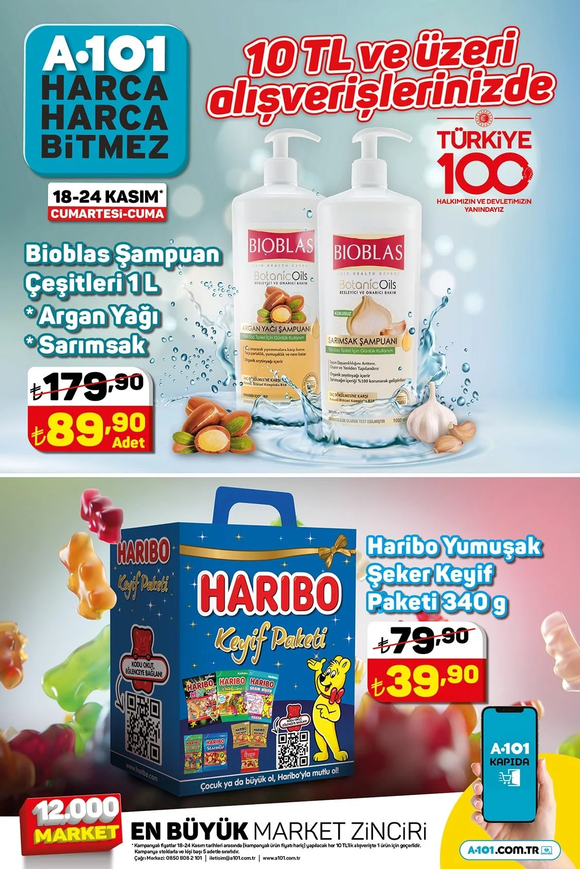 Öte yandan bu hafta A101'de hafta yapacağınız 10 lira üstü alışverişlerde 1 litre Bioblas Şampuan Çeşitleri 179,90 lira yerine 89,90 liraya ve 340 gram Haribo Yumuşak Şeker Keyif Paketi ise 79,90 lira yerine 39,90 liraya satılacak. Peki, A101'de diğer indirimli aktüel ürünlerin fiyatı ne kadar, kaç TL olacak? İşte A101 18-24 Kasım 2023 tarihleri arasında geçerli indirimli aktüel ürünler kataloğundaki ürünler...