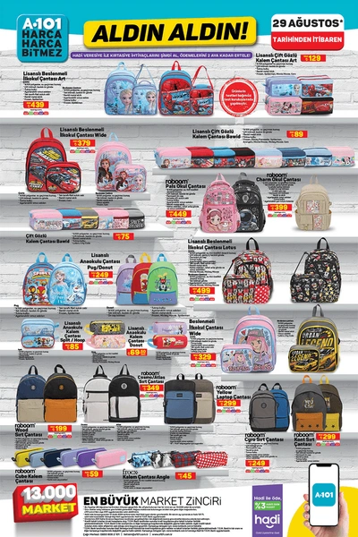 A101'de okul çantalarından kırtasiye ürünlerine, defterden kaleme, silgiden beslenme çantası ve su matarasına kadar birçok ürün raflarda yerini aldı.