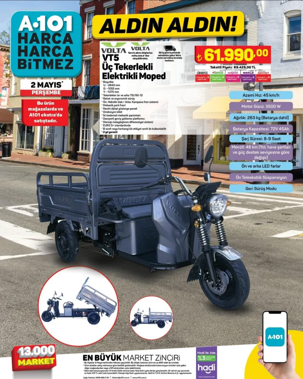 A101 Mayıs ayı indirimlerine başladığını duyurdu. A101 2 Mayıs 2024 perşembe aktüel kataloğunu paylaştı. Yarın A101'de Volta VT5 Üç Tekerlekli Elektrikli Moped 61.990 TL, Regal Beyaz Cam 3'lü Ankastre Set 13.499 TL, Çift Bölmeli 6 Kişilik Aile Kamp Çadırı 8.999 TL.
