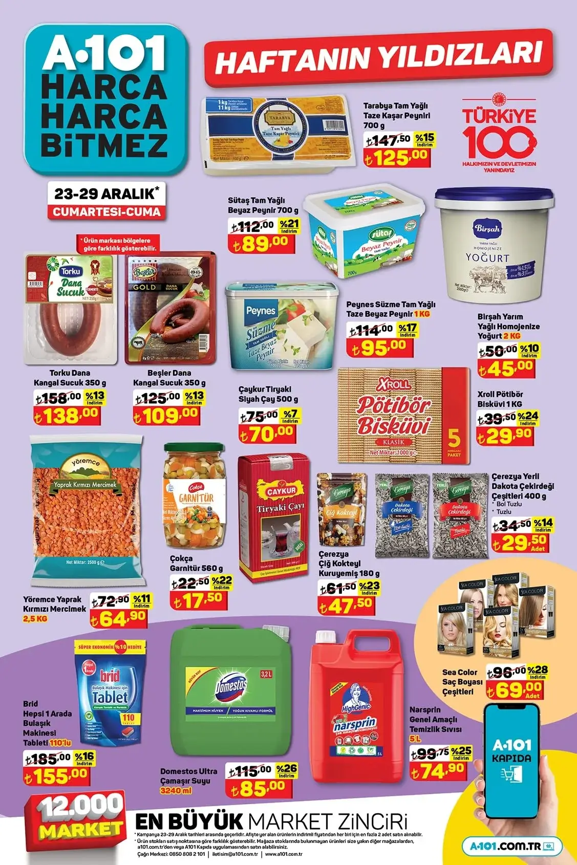 A101'in 23-29 Aralık tarihleri arasında geçerli indirimli aktüel ürünler kataloğu yayımlandı. A101'in fırsat ürünleri yüzde 30'a varan indirimlerle satışa çıkarılacak. A101'in indirimli ürünleri arasında Tarabya Tam Yağlı Taze Kaşar Peyniri, Beşler Dana Kangal Sucuk, Çaykur Tiryaki Siyah Çay ve Domestos Ultra Çamaşır Suyu gibi ürünler yer alıyor. Öte yandan a101'de 10 TL üstü alışveriş kampanyasında 12'li Papia Egzotk 3 Katlı Tuvalet Kağıdı / Selpak 3 Katlı Tuvalet Kağıdı 149,90 lira yerine 64,50 liraya ve 700 ml Duru Şampuan Çeşitleri ise 64,90 lira yerine 29,90 liraya satılacak. Peki, A101'de diğer indirimli ürünlerin fiyatı ne kadar, kaç TL? İşte A101 aktüel ürünler kataloğu fiyat listesi...