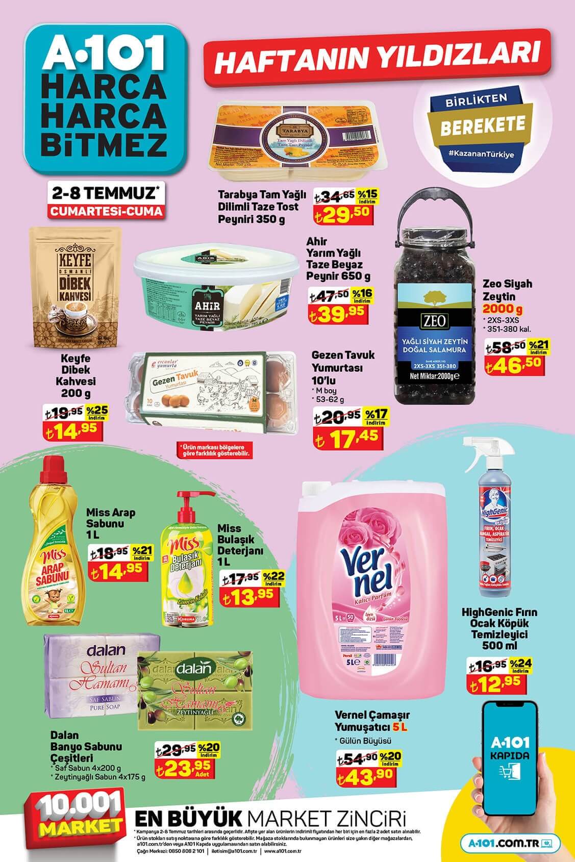 A101 Market'in 2-8 Temmuz 2022 tarihleri arasında geçerli aktüel ürünler kataloğu fiyat listesi belli oldu. Her hafta indirimli ürünlerini aktüel ürünler kataloğunda duyuran dev zincir markette bu haftada pek çok ürün yeni fiyatıyla raflarda yerini aldı. Peki A101'de bu hafta hangi ürünler indirime girdi? A101'de bu hafra, taze tost peyniri, zeytin, yumurta, kahve, ve temizlik ürünleri gibi birçok ürün indirime girdi. Peki bu ürünleri fiyatı ne oldu? İşte 4 Temmuz 2022 fiyat listesi...