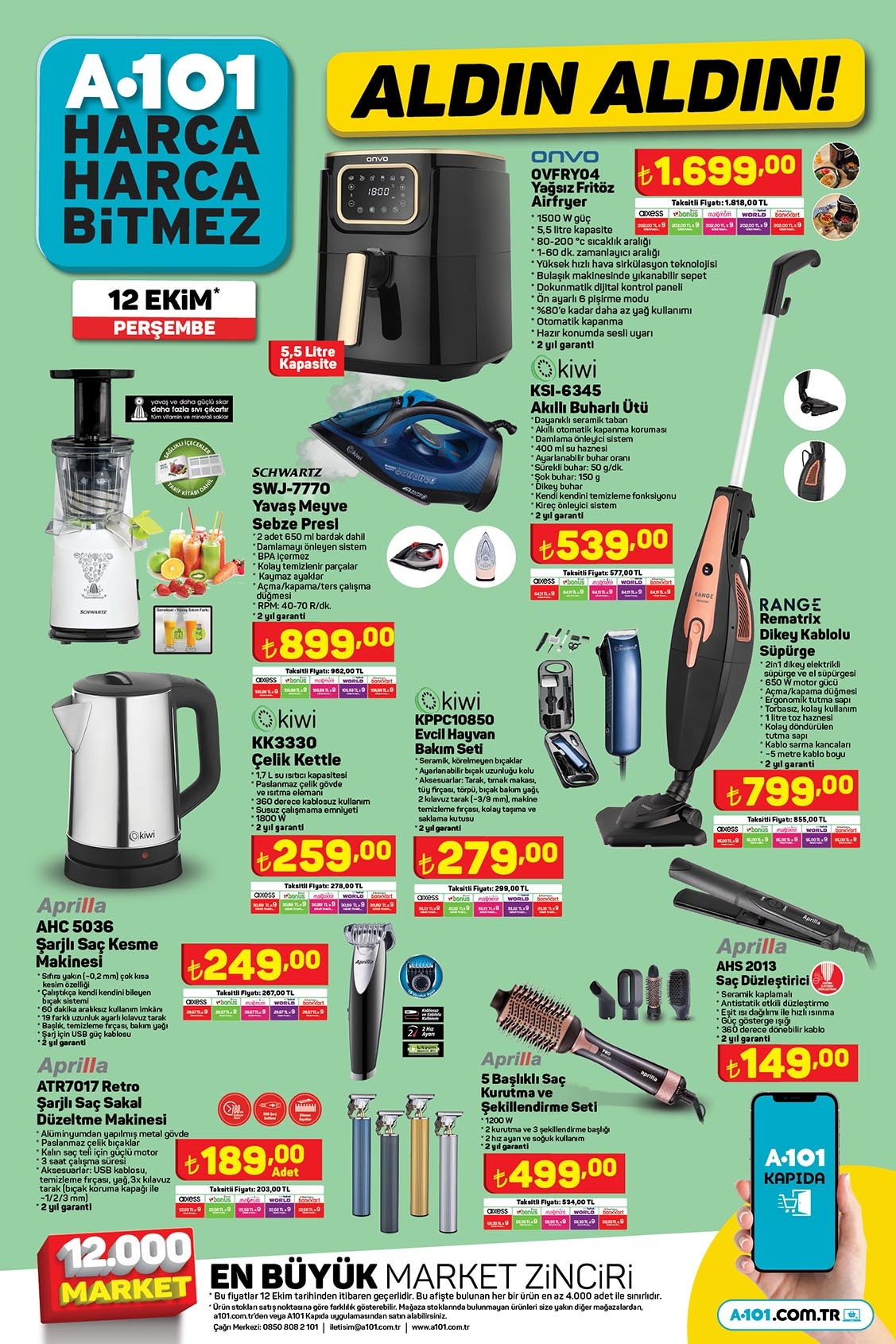 A101'in 12 Ekim tarihli aktüel ürünler kataloğu yayımlandı. Her hafta A101 tarafından satışa çıkarılan aktüel ürünler tüketiciler tarafından ilgiyle takip ediliyor. A101'de bu hafta Kiwi 3 Musluklu Su Sebili, APEC 49.4 CC Benzinli Moped, Toshiba 65" Ultra HD Android Tv, Taç Bella Döküm Basık Tencere, Onvo Yağsız Fritöz Airfryer ve 26 Jant Ön Sepetli Bisiklet satışa çıkarılacak. Satışa çıkarılacak ürünler arasında en dikkat çekeni APEC 49.4 CC Benzinli Moped oldu.