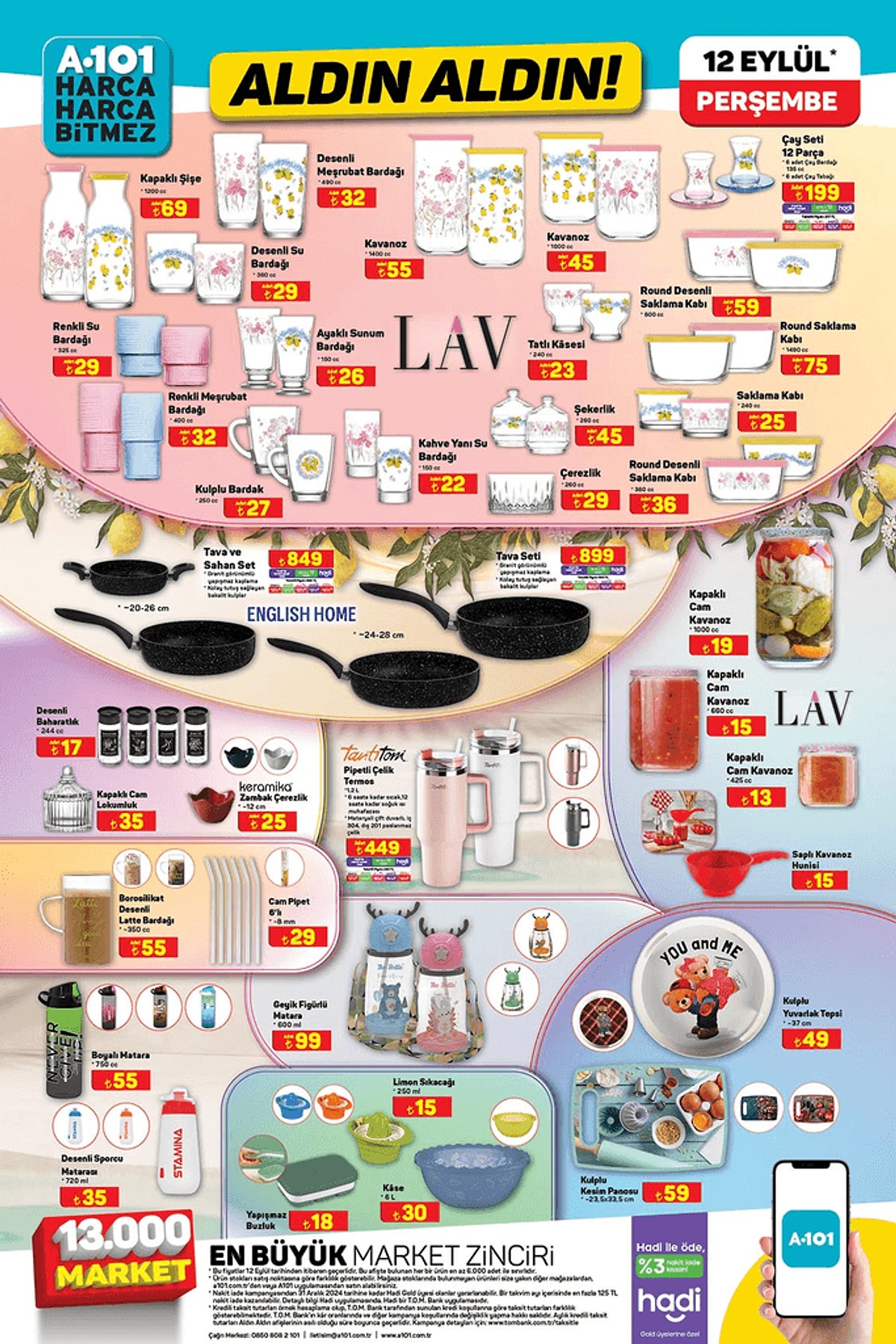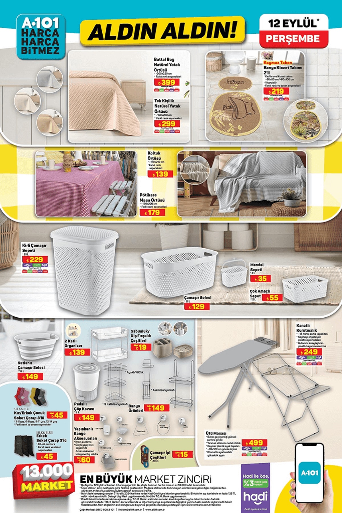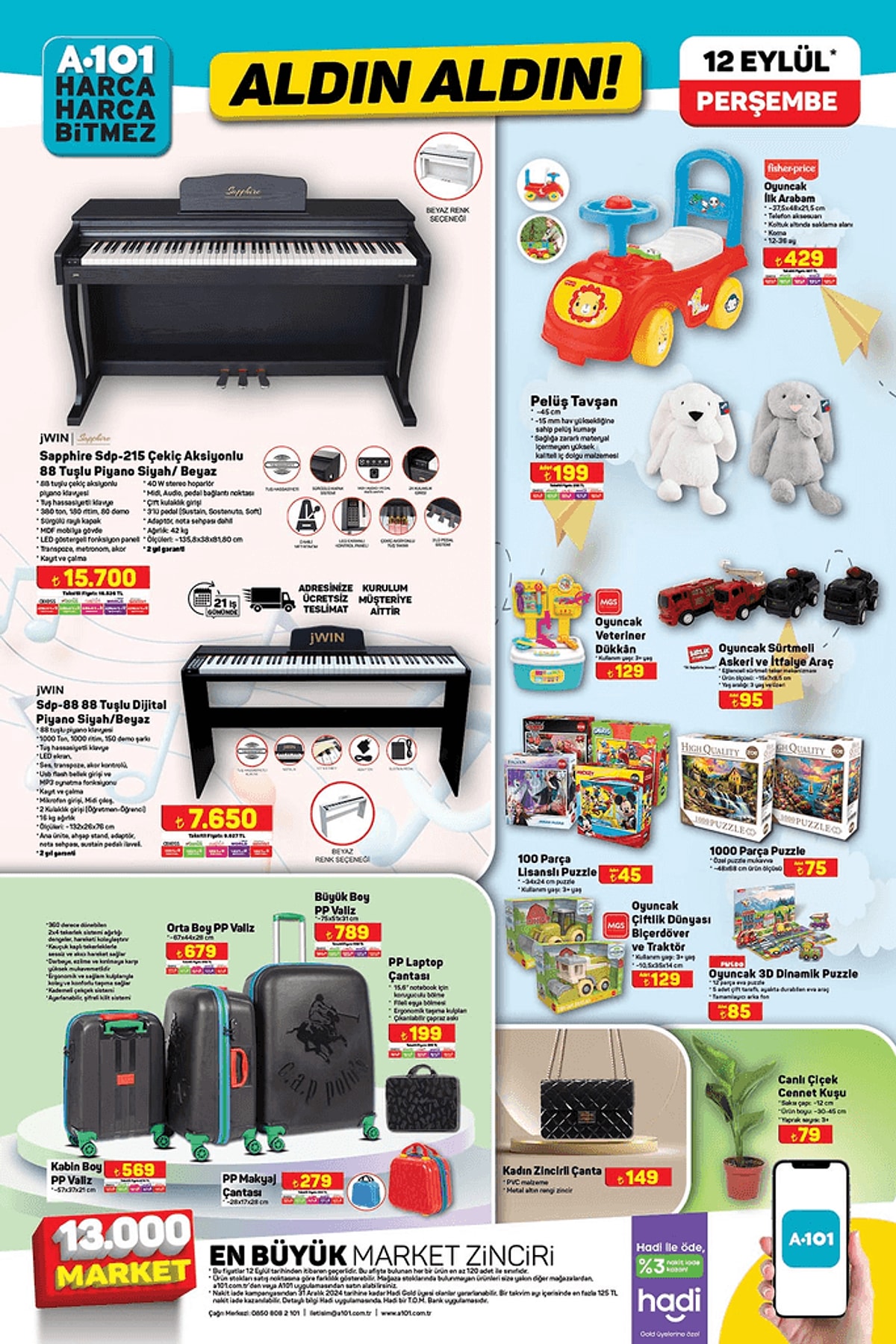 A101 12 Eylül 2024 aktüel ürünler kataloğunda birçok üründe indirim var. A101'e Toshiba 65' 4K Ultra HD Android Tv 20.990 TL, JWIN Sapphire Sdp-215 Çekiç Aksiyonlu 88 Tuşlu Piyano 15.700 TL, Arzum Pacco El Blender Seti 1.599 TL, Aprilla Şarjlı Saç Sakal Kesme Makinesi 399 TL.