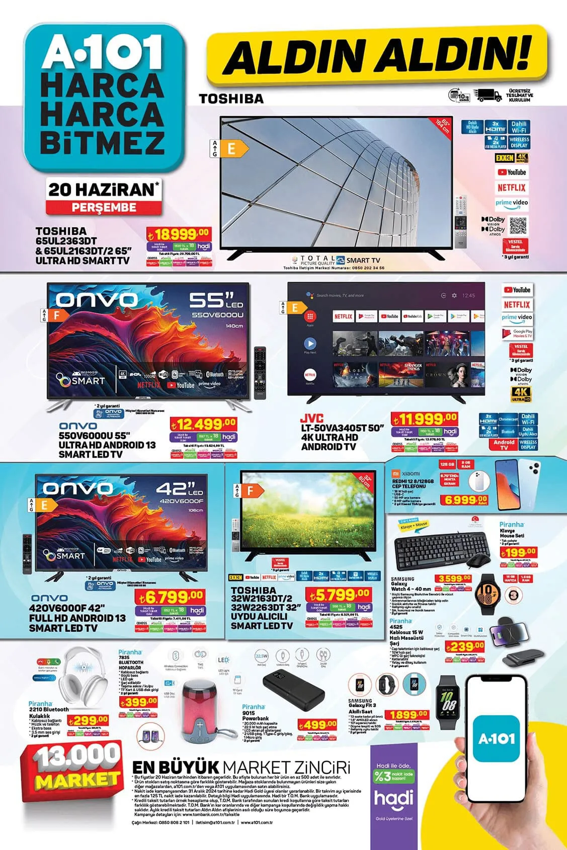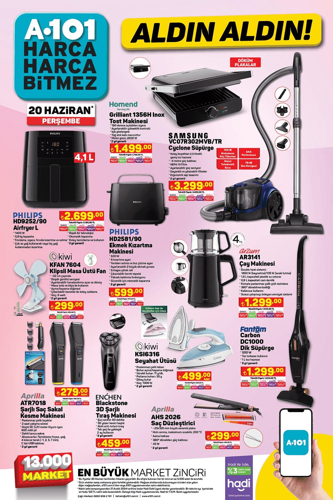 Perakende devi A101'in merakla beklenen 20 Haziran 2024 kataloğu resmi internet sitesinden yayımlandı. A101'e bu hafta tost makinesi, smart TV, zigon sehpa dik süpürge geliyor...