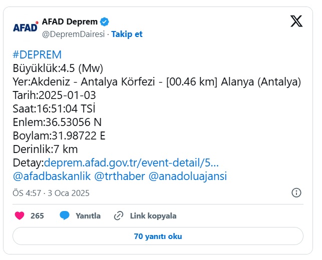 AFAD'ın sosyal medya üzerinden yaptığı açıklamada, Antalya'da meydana gelen 4.5 büyüklüğünde deprem 7 km derinliğinde gerçekleşti. 16.51'de gerçekleşen depremde herhangi bir olumsuzluk yaşanmadı.