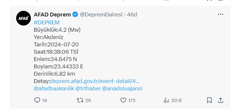 AFAD duyurdu! Akdeniz açıklarında 4,2'lik deprem meydana geldi!