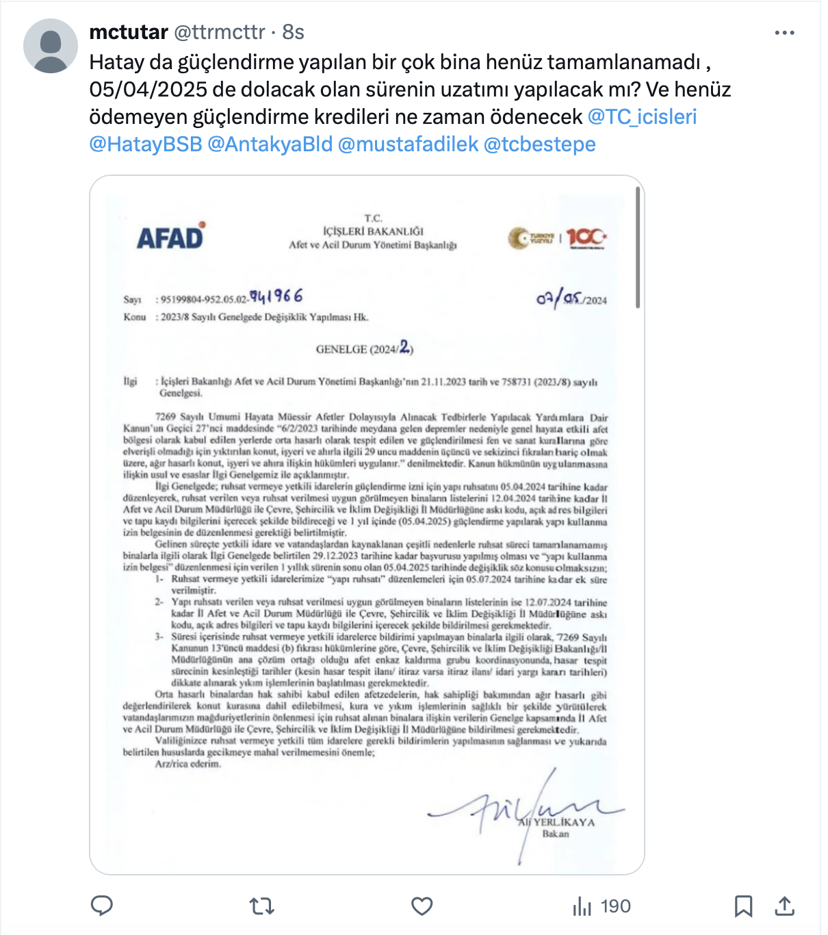 AFAD'ın sosyal medya hesabı üzerinden yaptığı paylaşım şu şekilde: