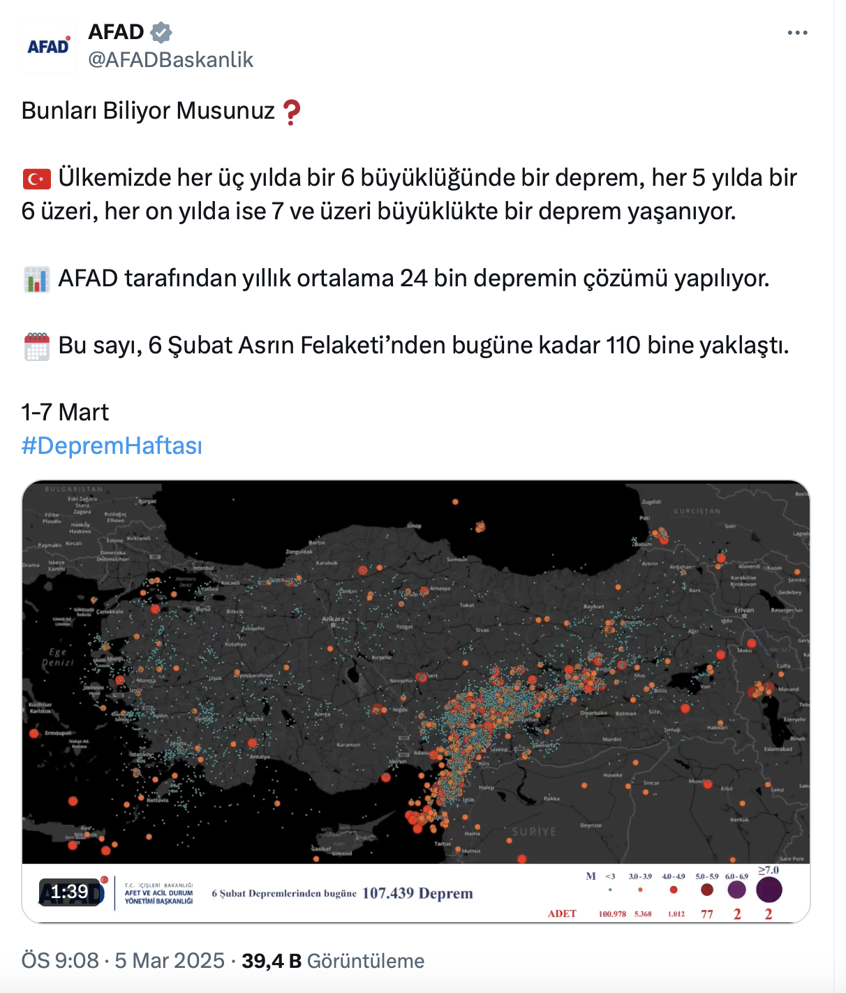 AFAD, sosyal medya hesabı https://x.com/AFADBaskanlik üzerinden yaptığı paylaşımda, son iki senede yaşanan sismik hareketliliği gözler önüne seren bir video yayımladı.