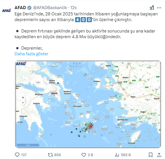 Afet ve Acil Durum Yönetimi Başkanlığı (AFAD), sosyal medya hesabından yapılan paylaşımda, Ege Denizi’nde, 28 Ocak 2025 tarihinden itibaren yoğunlaşmaya başlayan depremlerin sayısının 400’ün üzerine çıktığını açıkladı.
