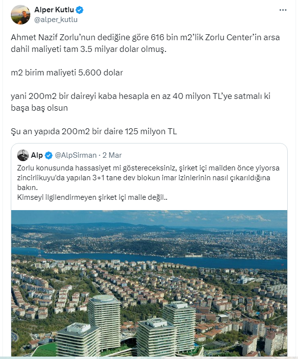 İnşaat Mühendisi Alper Kutlu, Ahmet Nazif Zorlu'nun, Zorlu Center’in arsa dahil maliyetinin tam 3.5 milyar dolar olduğuna dair yaptığı açıklamayı paylaştı.
