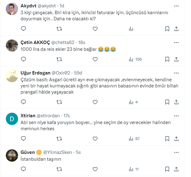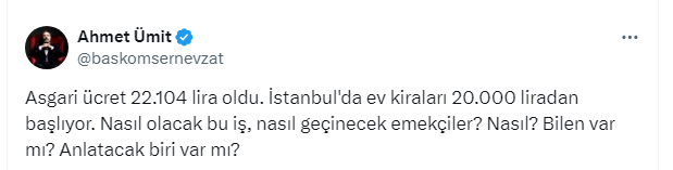 Ümit paylaşımında şunları söyledi: Asgari ücret 22.104 lira oldu. İstanbul'da ev kiraları 20.000 liradan başlıyor. Nasıl olacak bu iş, nasıl geçinecek emekçiler? Nasıl? Bilen var mı? Anlatacak biri var mı?