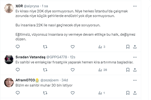 Ahmet Ümit, https://x.com/baskomsernevzat X sosyal medya hesabından yaptığı paylaşımda, İstanbul’da ev kiralarının 20 bin TL’den başladğını, asgari ücretlilerin bu maaşla nasıl geçinecekleri bilen varsa, anlatmasını istedi.