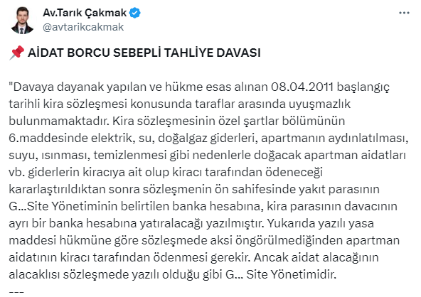 Site aidatlarıyla ilgili sosyal medya hesabından yargıtay kararını açıklayan Avukat Tarık Çakmak aidat borcunun ödenmemesi durumunda kiracıların tahliye edilmeyeceğini açıkladı.