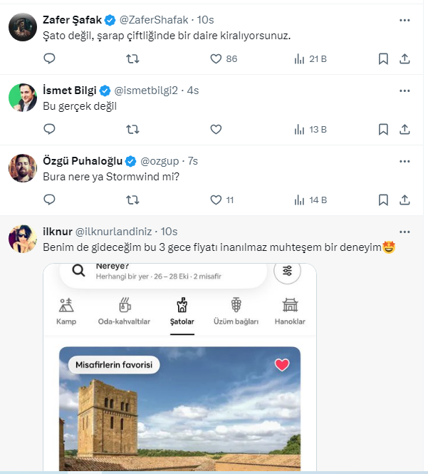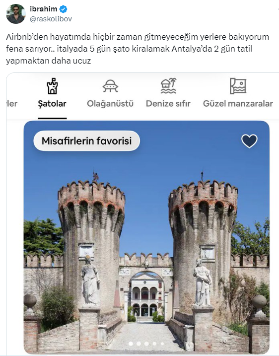 Tatil sezonun başlaması ile, tatilciler kiralık ev, villa, yazlık arayışısında. Bunun için Airbnb yönetemiyle ilanlar inceleniyor. Fiyatların tavan yaptığı şu günlerde vayandaşlar en uygun fiyata tatil yapmanın peşinde. X'de 61 bin 500 takipçisi olan İbrahim isimli twitter kullancısı sosyal medya hesabından yaptığı paylaşımda görenleri şaşkına çevirdi. İbrahim, airbnb ile italyada 5 gün şato kiralamak Antalya’da 2 gün tatil yapmaktan daha ucuz olduğunu söyledi ve o ilanı yayımladı. Takipçilerden ise adeta yorum yaağmuru geldi. İşte o paylaşım ve gelen yorumlar...