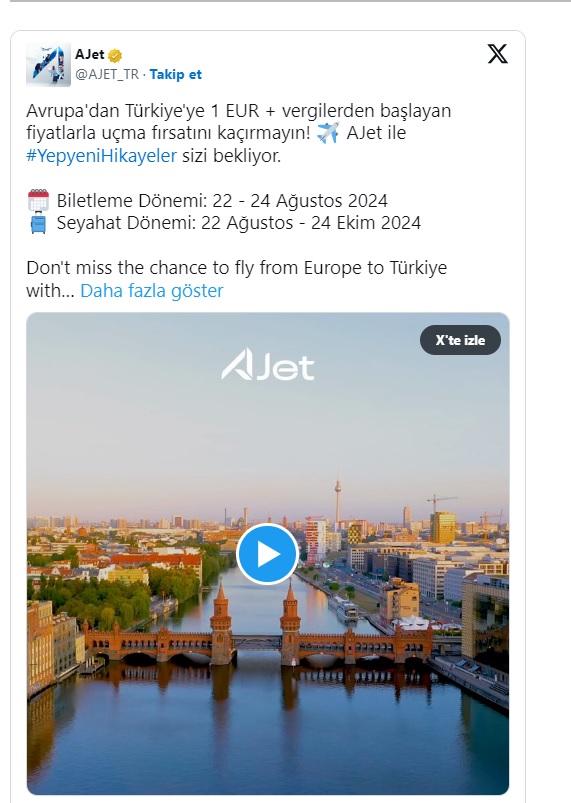 AJet tarafından sosyal medya hesabı X üzerinden yapılan açıklama kapsamında, 22-24 Ağustos tarihlerinde alınacak 22 Ağustos - 24 Ekim tarihleri arasında Avrupa'dan Türkiye'ye yapılacak seyahatlerle ilgili önemli bir kampanya başlattığını açıkladı.
