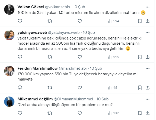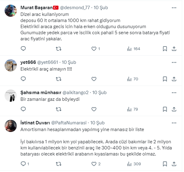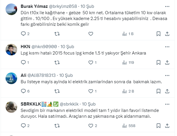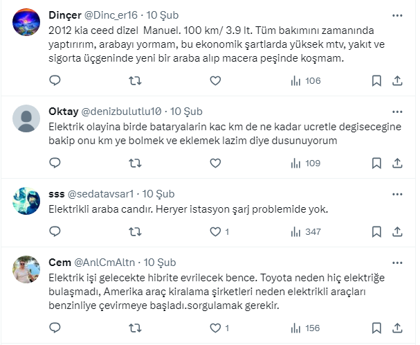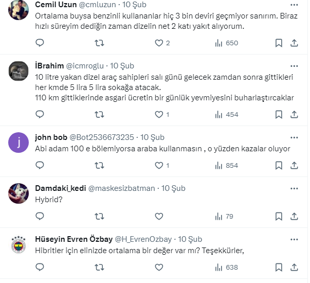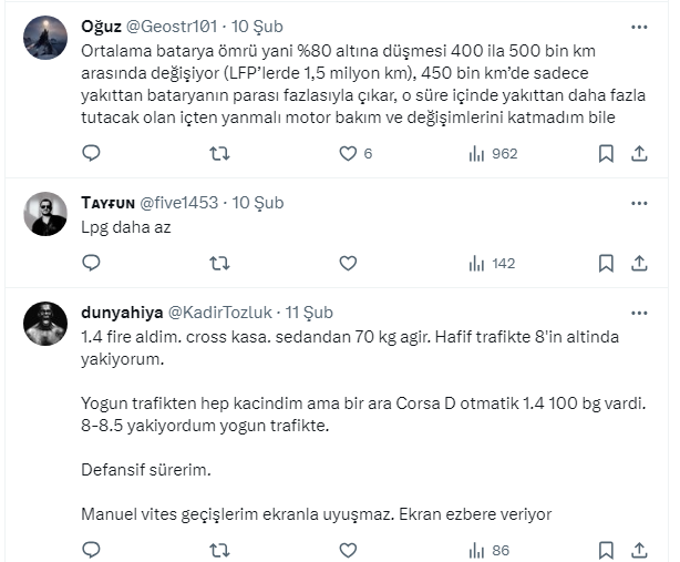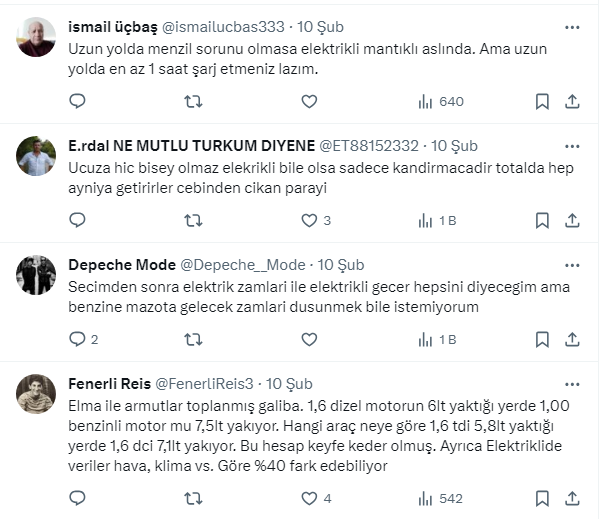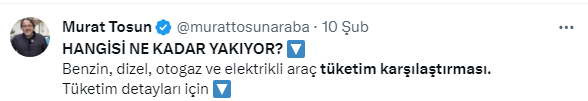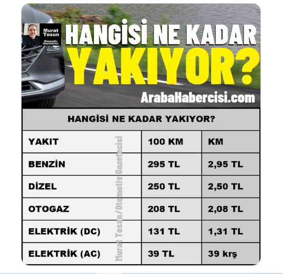 Araç sahipleri gelen zamlar karşısında ne yapacağını bilmezken, gazeteci Murat Tosun, https://twitter.com/murattosunaraba X sosyal medya hesabından Benzin, motorin, otogaz, elektrikli araçların 100 kilometrede ne kadar yakıt tükettiğini paylaştı. Tosun’un paylaşımına benzinli, dizel, elektrikli araç kullanıcılarından yorum yağdı.