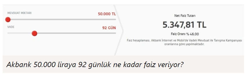50 bin lirası olan vatandaş Akbank'a geldiğinde; 32 gün vadeye yüzde 47 faiz oranı ile 1.900,55 Türk Lirası, 3 aylık vadeye yüzde 46 faiz oranı ile 5.347,81 Türk Lirası kazanç elde edebilirsiniz.