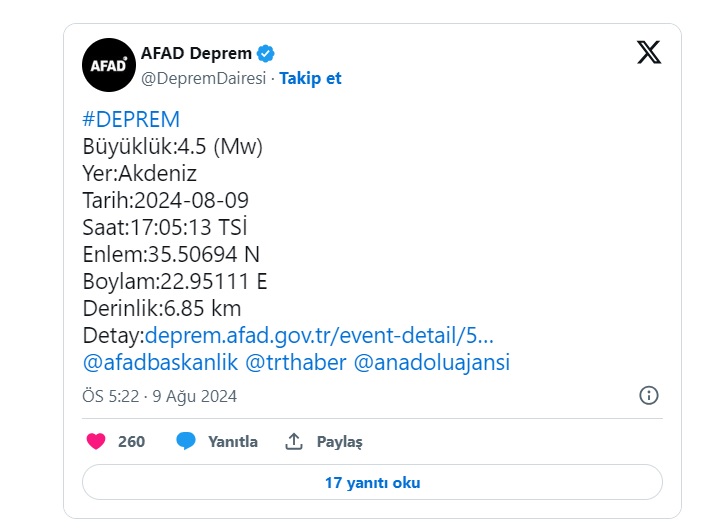 Afet ve Acil Durum Yönetimi (AFAD) açıkladı. Akdeniz'de 4,5 büyüklüğünde deprem meydana geldiği belirtildi.