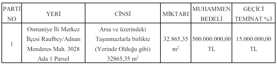 Osmaniye'de yer alan 32 bin 865 metrekare arsanın ise muhammen bedeli 500 milyon TL olarak açıklanırken söz konusu arsanın geçici teminat bedeli ise 15 milyon TL olarak açıklandı.