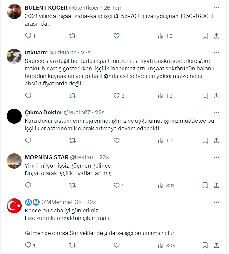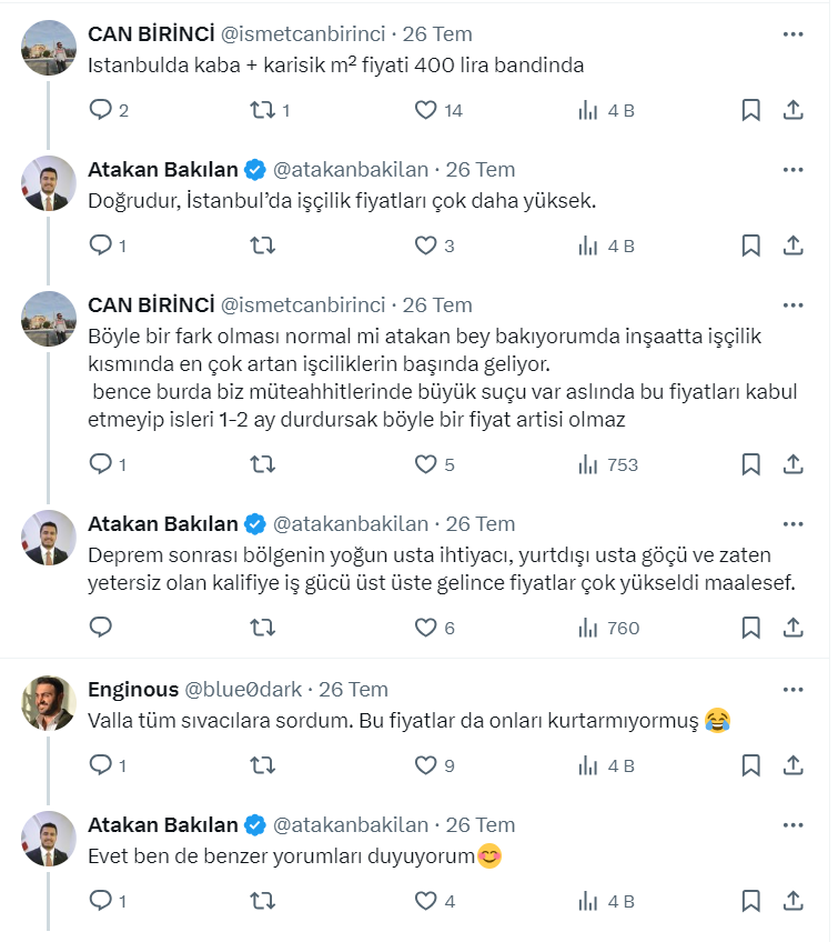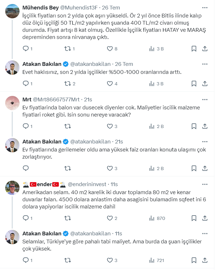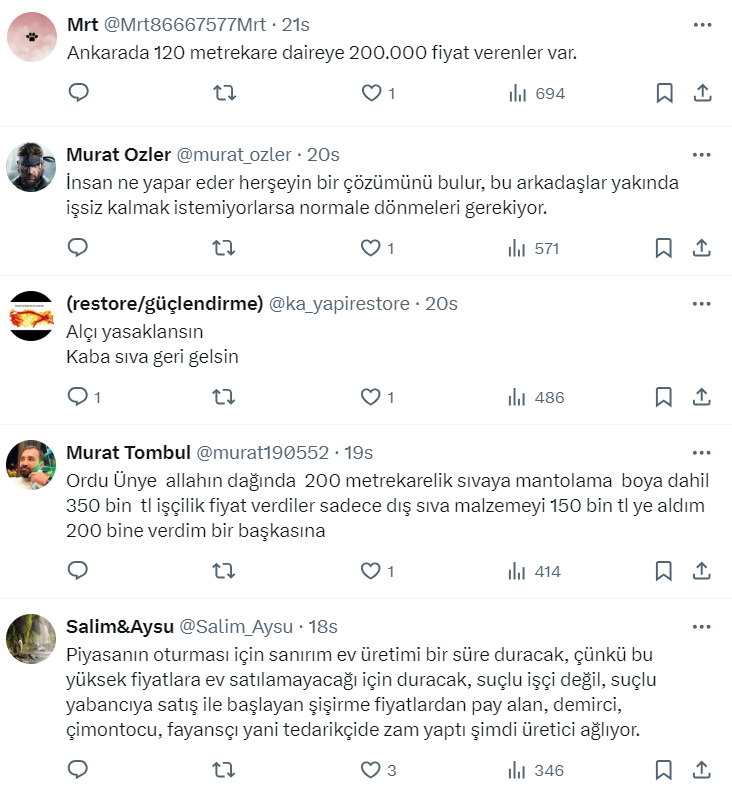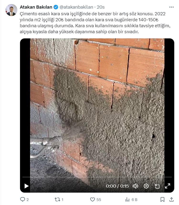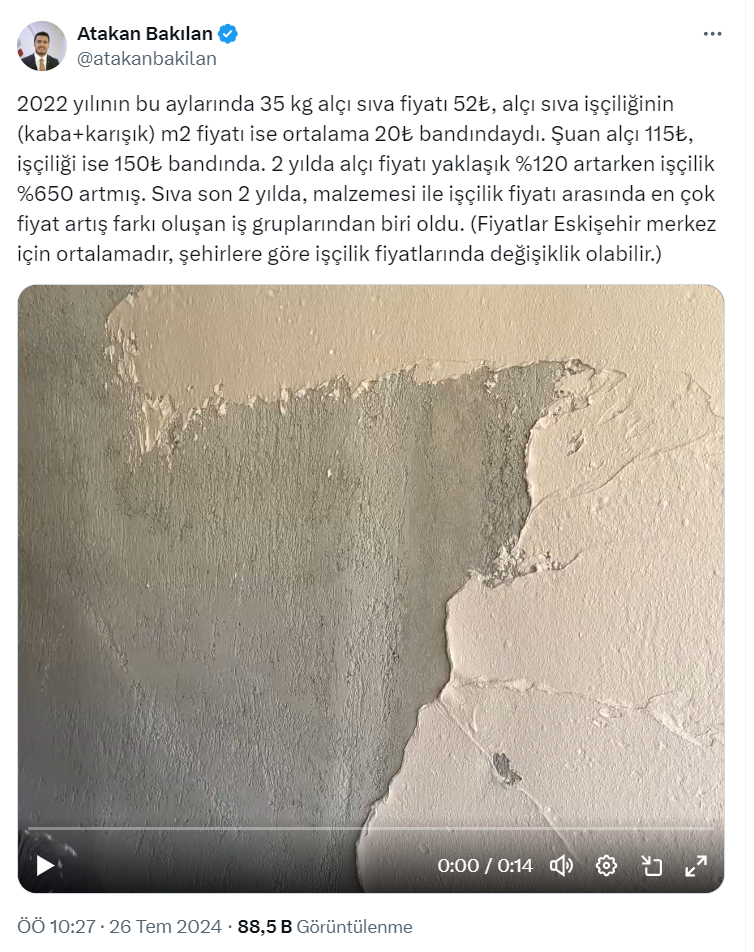 İnşaat mühendisi Atakan Bakılan resmi sosyal medya hesabı üzerinden yaptığı paylaşımda 2 yılda alçı fiyatlarının yaklaşık olarak yüzde 120, işçilik fiyatlarının ise yüzde 650 arttığını söyledi.