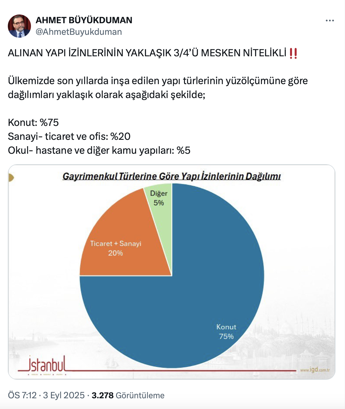 Ahmet Büyükduman resmi X hesabı https://x.com/AhmetBuyukduman üzerinden yaptığı paylaşımda alınan yapı izinlerinin yaklaşık 3/4’ünün mesken nitelikli olduğunu belirtti.