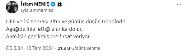 Altın fiyatları bu hafta kritik veri olan ABD enflasyon rakamlarına odaklanmıştı. Veri sonrası altın ve gümüşte düşüş trendi oluştuğunu söyleyen İslam Memiş sosyal medya hesabı X'ten önemli açıklamalarda bulundu.