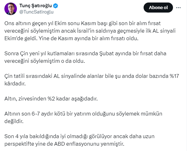 Altın fiyatları bugün de düşmeye devam ediyor. Yatırımcılar düşüş karşısında endişe duyarken, ekonomist Tunç Şatıroğlu altında alım satım fırsatıyla ilgili önemli değerlendirmelerde bulundu. Şatıroğlu altın fiyatlarındaki düşüşüne rağmen, uzun perspektifte yine de ABD enflasyonunu yendiğini söyledi. İşte ünlü ekonomist Tunç Şatıroğlu'nun o paylaşımı ve takipçilerden gelen yorumlar...