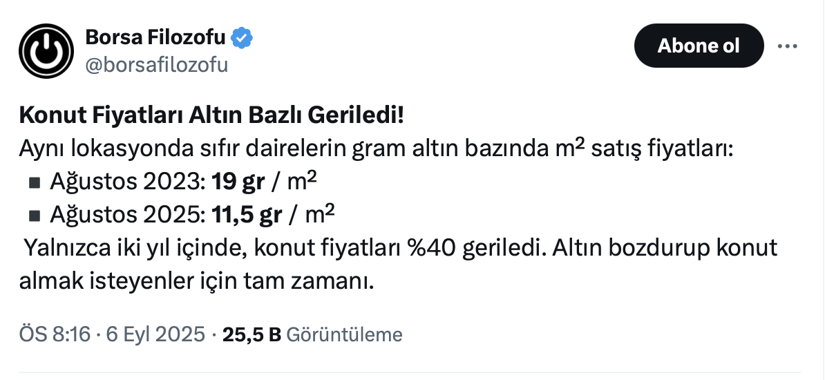250,5 bin takipçili Borsa Filozofu, resmi sosyal medya hesabı https://x.com/borsafilozofu üzerinden yaptığı paylaşımda konut fiyatlarının altın bazlı gerilediğini belirtti.